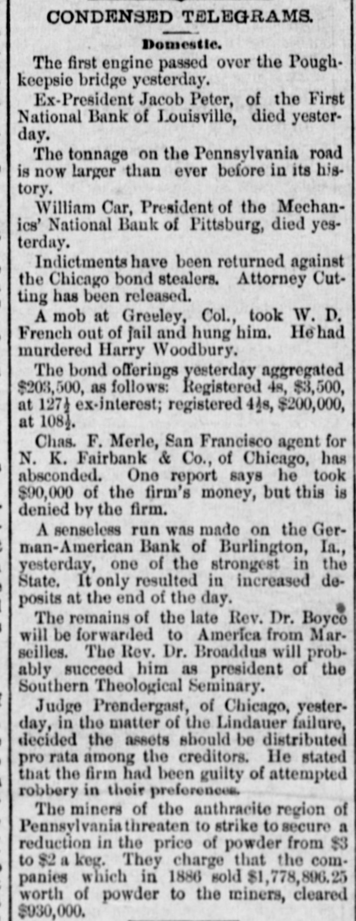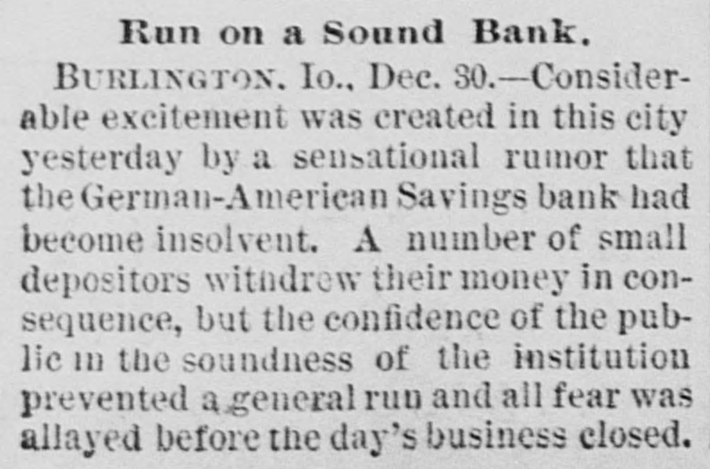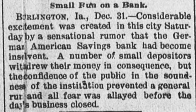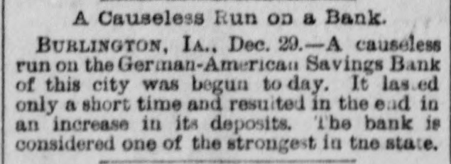 A CAUSELESS run was made on the German-American Savings Bank of Burlington, Iowa, the other day, but it lasted only a short time and had no bad effects.
