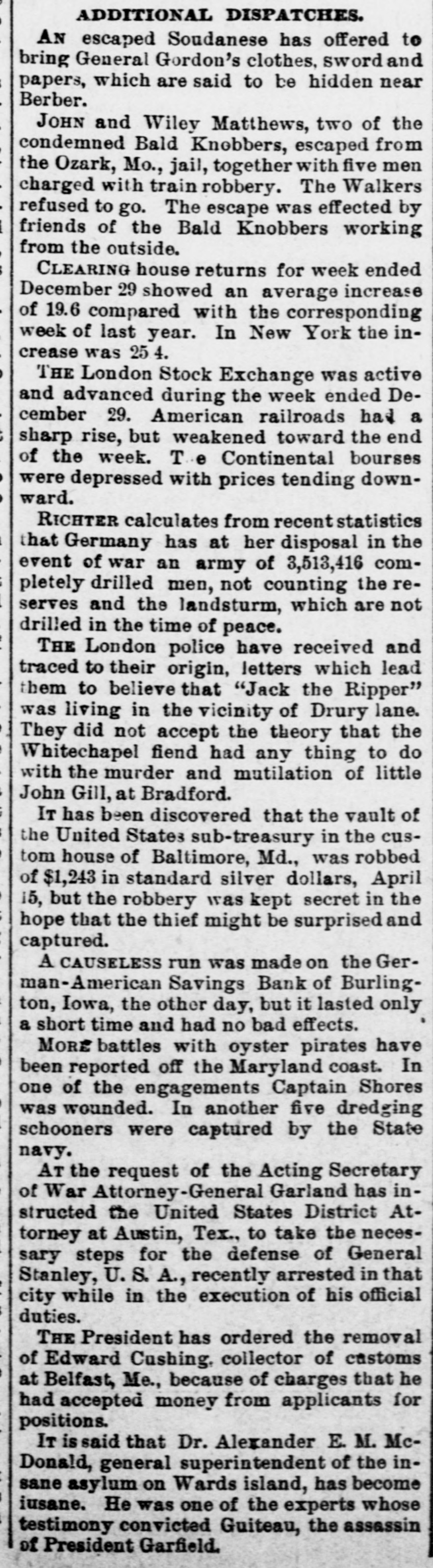 THE London police have received and traced to their origin, letters which lead them to believe that "Jack the Ripper" was living in the vicinity of Drury lane. They did not accept the theory that the Whitechapel fiend had any thing to do with the murder and mutilation of little John Gill, at Bradford.