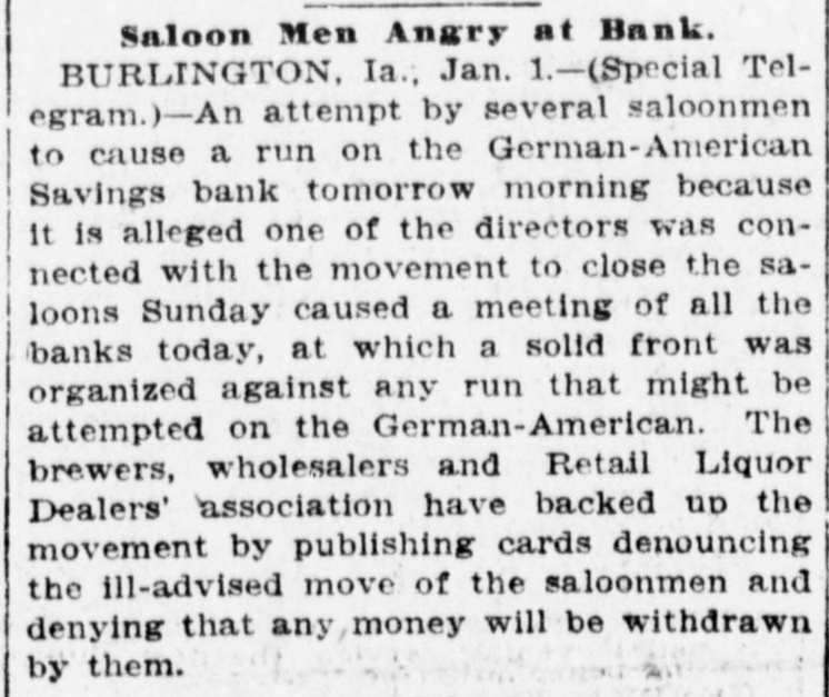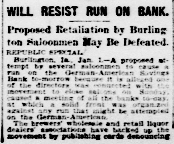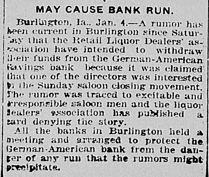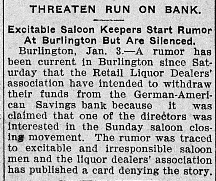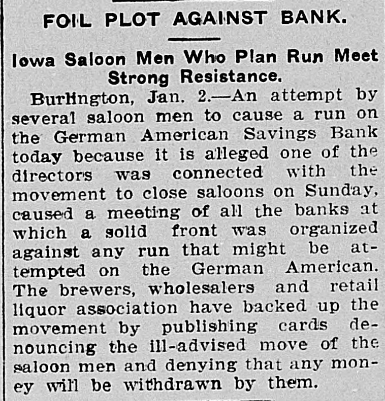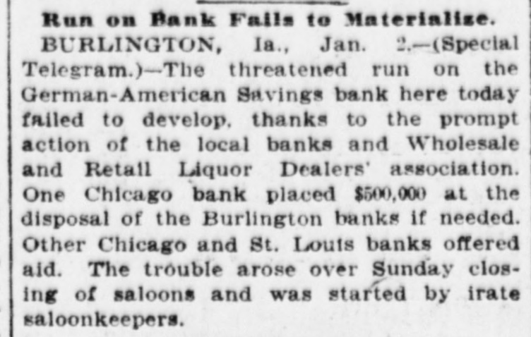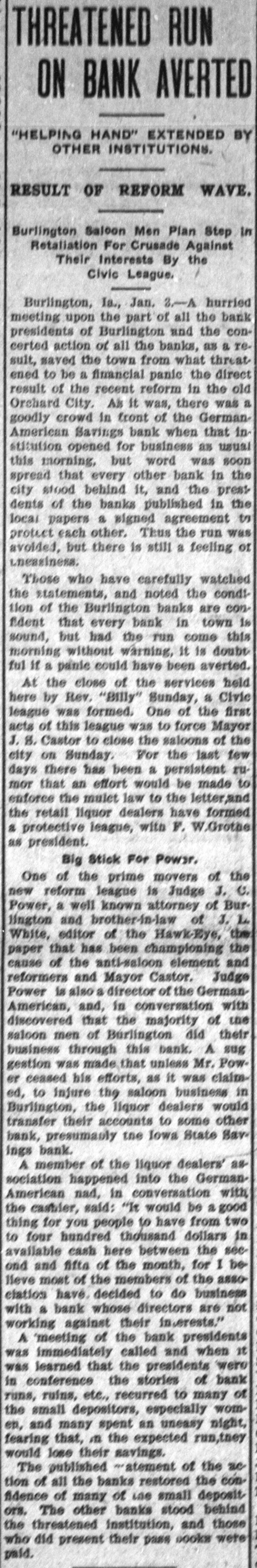 THREATENED RUN ON BANK AVERTED "HELPING HAND" EXTENDED BY OTHER INSTITUTIONS. RESULT OF REFORM WAVE. Burlington Saloon Men Plan Step in Retaliation For Crusade Against Their Interests By the / Civic League, Burlington, Ia., Jan. 3-A hurried meeting upon the part of all the bank presidents of Burlington and the concerted action of all the banks, as a result, saved the town from what threat ened to be a financial panic the direct result of the recent reform in the old Orchard City, Ah It was, there was a goodly crowd in front of the German American Savings bank when that in stitution opened for business as usual this BOOD that spread morning, every but other word bank was in the city stood behind it, and the prest dents of the banks published in the local papers a signed agreement to protect each other. Thus the run was avoided, but there is still a feeling of ineasiness. Those who have carefully watched the statements, and noted the condition of the Burlington banks are confident that every bank in town is sound, but had the run come this morning without warning, It 1s doubtful If a panic could have been averted. here a At by the Rev. close "Billy" of the Sunday, services Civic held league was formed. One of the first acts of this league was to force Mayor J.B. Castor to close the saloons of the city on Sunday, For the last few days there has been a persistent rumor that an effort would be made to enforce the mulet law to the letter,and the retail liquor dealers have F. W.Grothe formed a protective league, with as president. Big Stick For Powsr. One of the prime movers of the new reform league is Judge 3.0 Power, a well known attorney of Burlington and brother-In-law of 3.1 editor of the that has been paper White, championing Hawk-Eye, and the the anti-saloon and cause reformers of the Mayor Castor. element Judge Power is also a director of the GermanAmerican, and, in conversation with discovered that the majority of the saloon men of Burlington did their business through this bank. A sug made that gestion was unless Mr. claim- Power ceased his efforts, as it was ed, the saloon in the liquor Burlington, to injure dealers business would transfer their accounts to some other bank, presumanty the Iowa State Savings bank. A member of the liquor dealers' as happened into the Germanin American sociation nad, conversation with the cashier, said: "In would be a good for people to thing you have dollars from two in to four hundred thousand cash here see fifts of the month, available and and between for the I be of the decided to do etation lieve most have. members of the business asso not whose their with working a bank against directors interests." are A meeting of the bank presidents was immediately called and when it was learned that the presidents were in the stories conference to many of bank of runs, ruins, etc., recurred the en, spent an and small many depositors, especially uneasy night, womfearing that, m the expected run,they would Jose their savings. arement of the ac tion the banks restored The of published all the conof of use small depositother banks stood ors. fidence The many behind those the threatened institution, and who did present their pass books were paid.