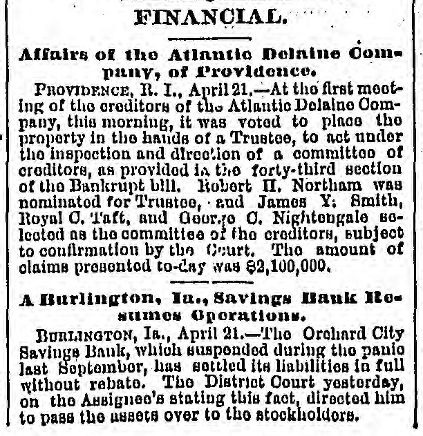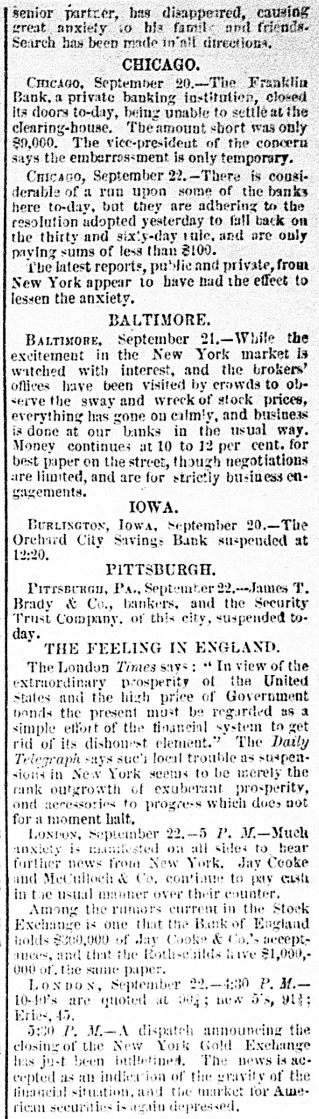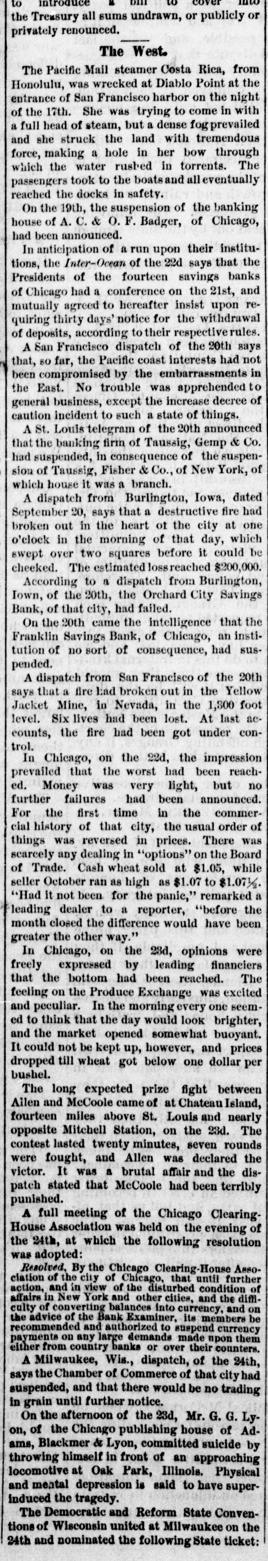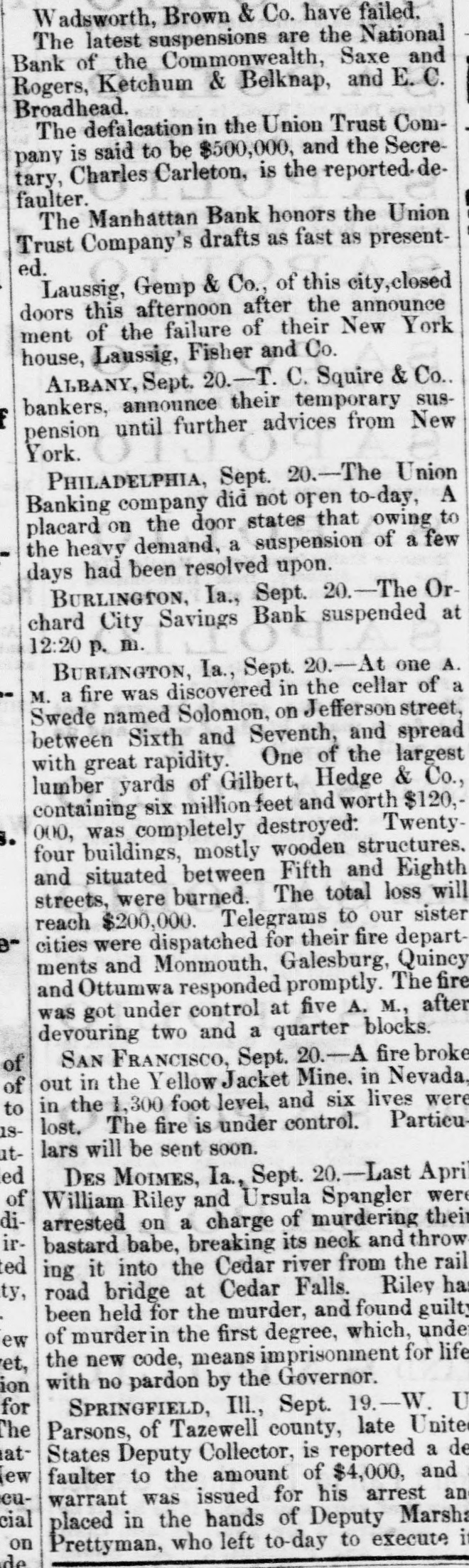 Wadsworth, Brown & Co. have failed. The latest suspensions are the National Bank of the Commonwealth, Saxe and Rogers, Ketchum & Belknap, and E.C. Broadhead. The defalcation in the Union Trust Company is said to be $500,000, and the Secretary, Charles Carleton, is the reported defaulter. The Manhattan Bank honors the Union Trust Company's drafts as fast as presented. Laussig, Gemp & Co., of this city, closed doors this afternoon after the announce ment of the failure of their New York house, Laussig, Fisher and Co. ALBANY, Sept. 20.-T. C. Squire & Co. bankers, announce their temporary suspension until further advices from New York. PHILADELPHIA, Sept. 20.-The Union Banking company did not open to-day, A placard on the door states that owing to the heavy demand, a suspension of a few days had been resolved upon. BURLINGTON, Ia., Sept. 20.-The Orchard City Savings Bank suspended at 12:20 p. m. BURLINGTON, Ia., Sept. 20.-At one A. M. a fire was discovered in the cellar of a Swede named Solomon, on Jefferson street, between Sixth and Seventh, and spread with great rapidity. One of the largest lumber yards of Gilbert, Hedge & Co., containing six million feet and worth $120,000, was completely destroyed: Twentyfour buildings, mostly wooden structures. and situated between Fifth and Eighth streets, were burned. The total loss will reach $200,000. Telegrams to our sister cities were dispatched for their fire depart ments and Monmouth, Galesburg, Quincy and Ottumwa responded promptly. The fire was got under control at five A. M., after devouring two and a quarter blocks. SAN FRANCISCO, Sept. 20.-A fire broke of out in the Yellow Jacket Mine. in Nevada of in the 1,300 foot level, and six lives were to lost. The fire is under control. Particu18lars will be sent soon. uted DES MOIMES, Ia., Sept. 20. - -Last April of William Riley and Ursula Spangler were diarrested on a charge of murdering their its irted into the ing bastard it babe, breaking Cedar river neck from and the throw rail ty, road bridge at Cedar Falls. Riley ha been held for the murder, and found guilty of murder in the first degree, which, under ew the new code, means imprisonment for life et, with no pardon by the Governor. ion for SPRINGFIELD, Ill., Sept. 19.-W. U The Parsons, of Tazewell county, late Unite atStates Deputy Collector, is reported a de few faulter to the amount of $4,000, and cuwarrant was issued for his arrest an cial placed in the hands of Deputy Marsha on Prettyman, who left to-day to execute it