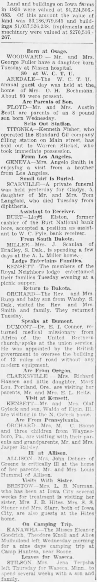 Land and buildings on Iowa farms in 1930 were valued at $4,224,506.083. Of this amount the value of land was $3,186,979,845 and buildings Implements and machinery were valued at $270,516,267. Born at Osage. WOODWARD Mr. and Mrs. George Fuller have a daughter born Tuesday at Nissen hospital. 80 at W. C. Γ. U. AREDALE-The W. C. T. U. annual guest day was held at the home of Mrs. O. H. Bochmann. About 80 were present. Are Parents of Son. FLOYD- and Mrs. Austin Scott are parents of an 8 pound son born Wednesday Sells Out Station. Fisher, who operated the Standard Oil company filling station on Main street, has sold out to Warren Stickel, who took immediate possession. From Los Angeles. GENEVA- Angelo Smith is enjoying a visit from a brother from Los Angeles. Small Girl Is Burled. SCARVILLE private funeral was held yesterday for Gladys, 5, daughter of Mr. and Mrs. Tom Langfald, who died Tuesday from Assistant to Receiver. BURT Lloyd Elston, former cashier of the Burt National bank here, accepted a position as assistant to W. C. Pyle, bank receiver. From South Dakota. MILLER Mrs. J. Scanlan of Bradley, S. Dak., is spending a few days at the A. L. Miller home. Lodge Entertains Families. KENSETT- The members of the Royal Neighbors lodge entertained their families Tuesday evening at a picnic supper Return to Dakota. ORCHARD The Rev. and Mrs Rupp and baby son from Wauby S. Dak., visited the Rev. and Mrs Smith and family. They returned Tuesday Speaks at Dumont DUMONT Dr. E. I. Conner returned medical missionary from Africa of the United Brethern church. spoke at the union service He was appointed by the British government to oversee the building of 12 miles of road without any modern equipment. Are From Oregon. CLARKSVILLE Mrs. Richard Hansen and little daughter Mary Lou, Portland Ore. are visiting her parents, Mr. and Mrs. E. L. Reitz. Visit at Kensett KENSETT- Mr. and Mrs. Olaf Gyleck and son. Waldo of Elgin III. are visiting in the N. Gyleck home. Are From Pennsylvania. ORCHARD Mrs. M. Boone and three children from Waynesboro, Pa. visiting with their parents and grandparents, Mr. and Mrs. Jasper III at Allison ALLISON Mrs. John Dobner of Greene is critically III at the home of her parents. Mr. and Mrs. Louis Hummel of Allison. Visits With Sister BRISTOW Mrs. L. B. Norman who has been at Iowa City several weeks for treatment is visiting her sister. Mrs J. B. Hites. Mrs. S. Stoner and Mrs. Starr both of Iowa City, are also guests at the Hites home. On Camping Trip. KANAWHA- The Misses Eleanor Goodrich Theodore Knoll and Alice Mulhullond left Wednesday morning for a nine days camping trip at Camp Hantesa, near Boone Leaves for Waseca STILSON Mrs. Jena Terpsha left Thursday for Waseca Minn. to spend several weeks with a son and family.