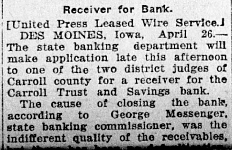 Receiver for Bank. [United Press Leased Wire Service.J DES MOINES, Iowa, April 26.The state banking department will make application late this afternoon to one of the two district judges of Carroll county for a receiver for the Carroll Trust and Savings bank. The cause of closing the bank, according to George Messenger, state banking commissioner, was the indifferent quality of the receivables,