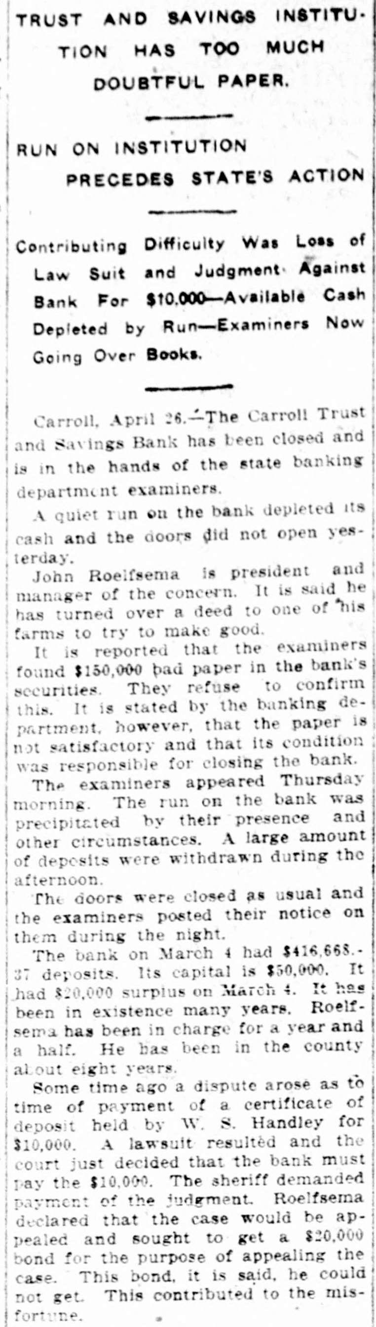 TRUST AND SAVINGS INSTITUTION HAS TOO MUCH DOUBTFUL PAPER. RUN ON INSTITUTION PRECEDES STATE'S ACTION Contributing Difficulty Was Loss of Law Suit and Judgment Against Bank For $10,000-Available Cash Depleted by Run-Examiners Now Going Over Books. Carroll, April 26.-The Carroll Trust and Savings Bank has been closed and is in the hands of the state banking department examiners. A quiet run on the bank depleted its cash and the doors did not open yesterday. John Roelfsema is president and manager of the concern. It is said he has turned over a deed to one of "his farms to try to make good. It is reported that the examiners found $150,000 pad paper in the bank's securities. They refuse to confirm this. It is stated by the banking department. however, that the paper is not satisfactory and that its condition was responsible for closing the bank. The examiners appeared Thursday morning. The run on the bank was precipitated by their presence and other circumstances. A large amount of deposits were withdrawn during the afternoon. The doors were closed as usual and the examiners posted their notice on them during the night. The bank on March 4 had $416,668.37 deposits. Its capital is $50,000. It had $20,000 surplus on March 4. It has been in existence many years. Roelfsema has been in charge for a year and a half. He has been in the county about eight years. Some time ago a dispute arose as to time of payment of a certificate of deposit held by W. S. Handley for $10,000. A lawsuit resulted and the court just decided that the bank must pay the $10,000. The sheriff demanded payment of the judgment. Roelfsema declared that the case would be appealed and sought to get a $20,000 bond for the purpose of appealing the case. This bond, it is said, he could not get. This contributed to the misfortune.