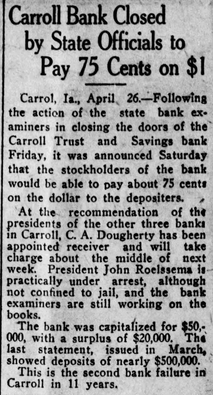 Carroll Bank Closed by State Officials to Pay 75 Cents on $1 Carrol, Ia., April 26.-Following the action of the state bank examiners in closing the doors of the Carroll Trust and Savings bank Friday, it was announced Saturday that the stockholders of the bank would be able to pay about 75 cents on the dollar to the depositers. At the recommendation of the presidents of the other three banks in Carroll, C. A. Dougherty has been appointed receiver and will take charge about the middle of next week. President John Roelssema is practically under arrest, although not confined to jail, and the bank examiners are still working on the books. The bank was capitalized for $50,000, with a surplus of $20,000. The last statement, issued in March, showed deposits of nearly $500,000. This is the second bank failure in Carroll in 11 years.