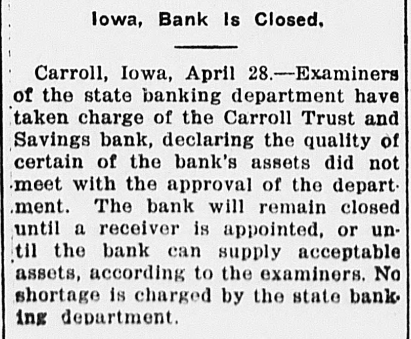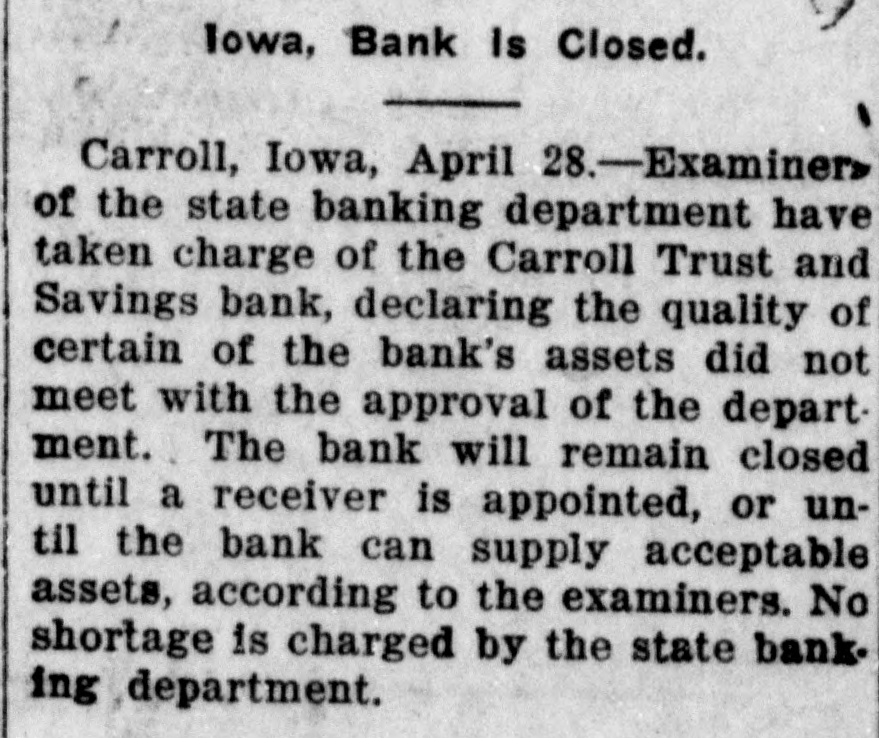 Iowa, Bank Is Closed. Carroll, Iowa, April 28.-Examiner> of the state banking department have taken charge of the Carroll Trust and Savings bank, declaring the quality of certain of the bank's assets did not meet with the approval of the department. The bank will remain closed until a receiver is appointed, or until the bank can supply acceptable assets, according to the examiners. No shortage is charged by the state banking department.