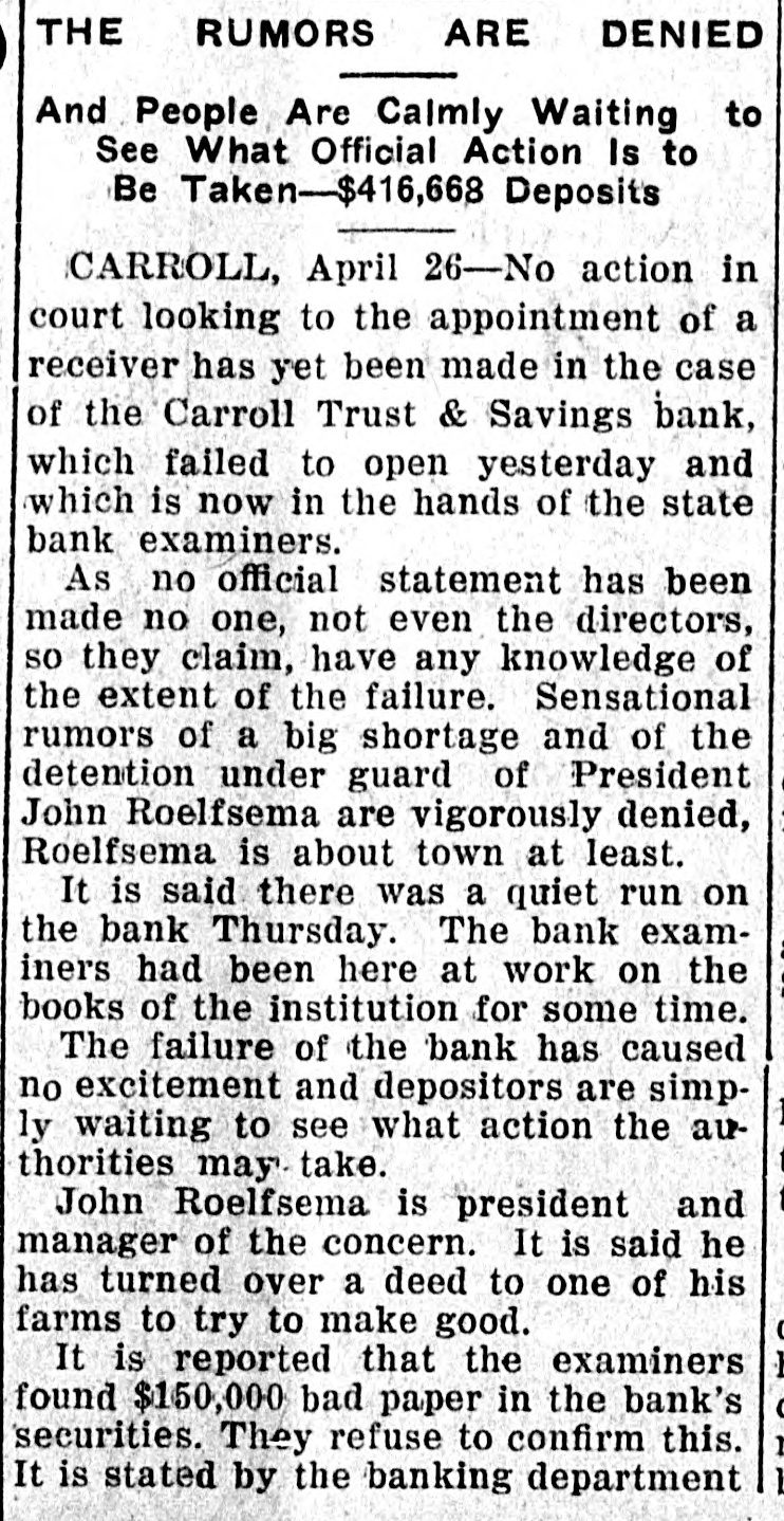 THE RUMORS ARE DENIED And People Are Calmly Waiting to See What Official Action Is to Be Taken-$416,668 Deposits CARROLL, April 26-No action in court looking to the appointment of a receiver has yet been made in the case of the Carroll Trust & Savings bank, which failed to open yesterday and which is now in the hands of the state bank examiners. As no official statement has been made no one, not even the directors, so they claim, have any knowledge of the extent of the failure. Sensational rumors of a big shortage and of the detention under guard of President John Roelfsema are vigorously denied, Roelfsema is about town at least. It is said there was a quiet run on the bank Thursday. The bank examiners had been here at work on the books of the institution for some time. The failure of the bank has caused no excitement and depositors are simply waiting to see what action the authorities may take. John Roelfsema is president and manager of the concern. It is said he has turned over a deed to one of his farms to try to make good. It is reported that the examiners found $150,000 bad paper in the bank's securities. They refuse to confirm this. It is stated by the banking department