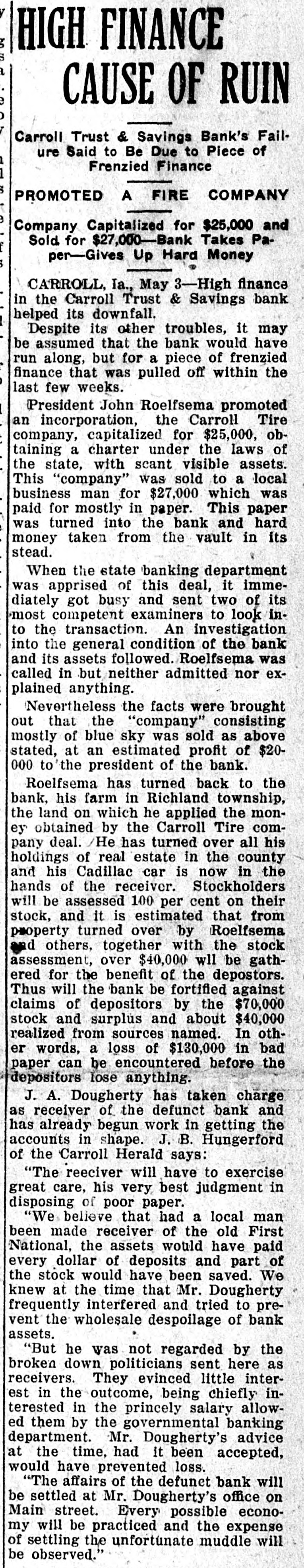 HIGH FINANCE CAUSE OF RUIN Carroll Trust & Savings Bank's Fail ure Said to Be Due to Piece of Frenzied Finance PROMOTED A FIRE COMPANY Company Capitalized for $25,000 and Sold for $27,000-Bank Takes Paper-Gives Up Hard Money CARROLL, Ia., May 3-High finance in the Carroll Trust & Savings bank helped its downfall. I Despite its other troubles, it may be assumed that the bank would have run along, but for a piece of frenzied finance that was pulled off within the last few weeks. President John Roelfsema promoted an incorporation, the Carroll Tire company, capitalized for $25,000, obtaining a charter under the laws of the state, with scant visible assets. This "company" was sold to a local business man for $27,000 which was paid for mostly in paper. This paper was turned into the bank and hard money taken from the vault in its stead. When the state banking department was apprised of this deal, it immediately got busy and sent two of its most competent examiners to look into the transaction. An investigation into the general condition of the bank and its assets followed. Roelfsema was called in but neither admitted nor explained anything. Nevertheless the facts were brought out that the "company" consisting mostly of blue sky was sold as above stated, at an estimated profit of $20000 to the president of the bank. Roelfsema has turned back to the bank, his farm in Richland township, the land on which he applied the money obtained by the Carroll Tire company deal. He has turned over all his holdings of real estate in the county and his Cadillac car is now in the hands of the receiver. Stockholders will be assessed 100 per cent on their stock, and it is estimated that from property turned over by Roelfsema and others, together with the stock assessment, over $40,000 will be gathered for the benefit of the depostors. Thus will the bank be fortified against claims of depositors by the $70,000 stock and surplus and about $40,000 realized from sources named. In other words, a loss of $130,000 in bad paper can be encountered before the depositors lose anything. J. A. Dougherty has taken charge as receiver of the defunct bank and has already begun work in getting the accounts in shape. J. B. Hungerford of the Carroll Herald says: "The reeciver will have to exercise great care, his very best judgment in disposing of poor paper. "We believe that had a local man been made receiver of the old First National, the assets would have paid every dollar of deposits and part of the stock would have been saved. We knew at the time that Mr. Dougherty frequently interfered and tried to prevent the wholesale despoilage of bank assets. "But he was not regarded by the broken down politicians sent here as receivers. They evinced little interest in the outcome, being chiefly interested in the princely salary allowed them by the governmental banking department. Mr. Dougherty's advice at the time, had it been accepted, would have prevented loss. "The affairs of the defunet bank will be settled at Mr. Dougherty's office on Main street. Every possible economy will be practiced and the expense of settling the unfortunate muddle will be observed."