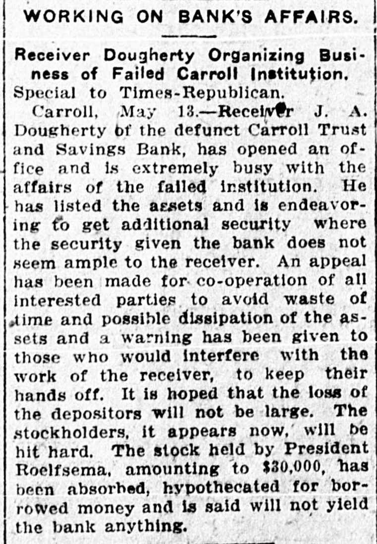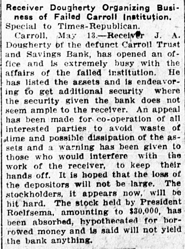 Receiver Dougherty Organizing Business of Failed Carroll Institution. Special to Times-Republican. Carroll, May 13.-Receiver J. A. Dougherty of the defunct Carroll Trust and Savings Bank, has opened an office and is extremely busy with the affairs of the failed institution. He has listed the assets and is endeavoring to get additional security where the security given the bank does not seem ample to the receiver. An appeal has been made for co-operation of all interested parties to avoid waste of time and possible dissipation of the assets and a warning has been given to those who would interfere with the work of the receiver, to keep their hands off. It is hoped that the loss of the depositors will not be large. The stockholders, it appears now, will be hit hard. The stock held by President Roelfsema, amounting to $30,000, has been absorbed, hypothecated for borrowed money and is said will not yield the bank anything.