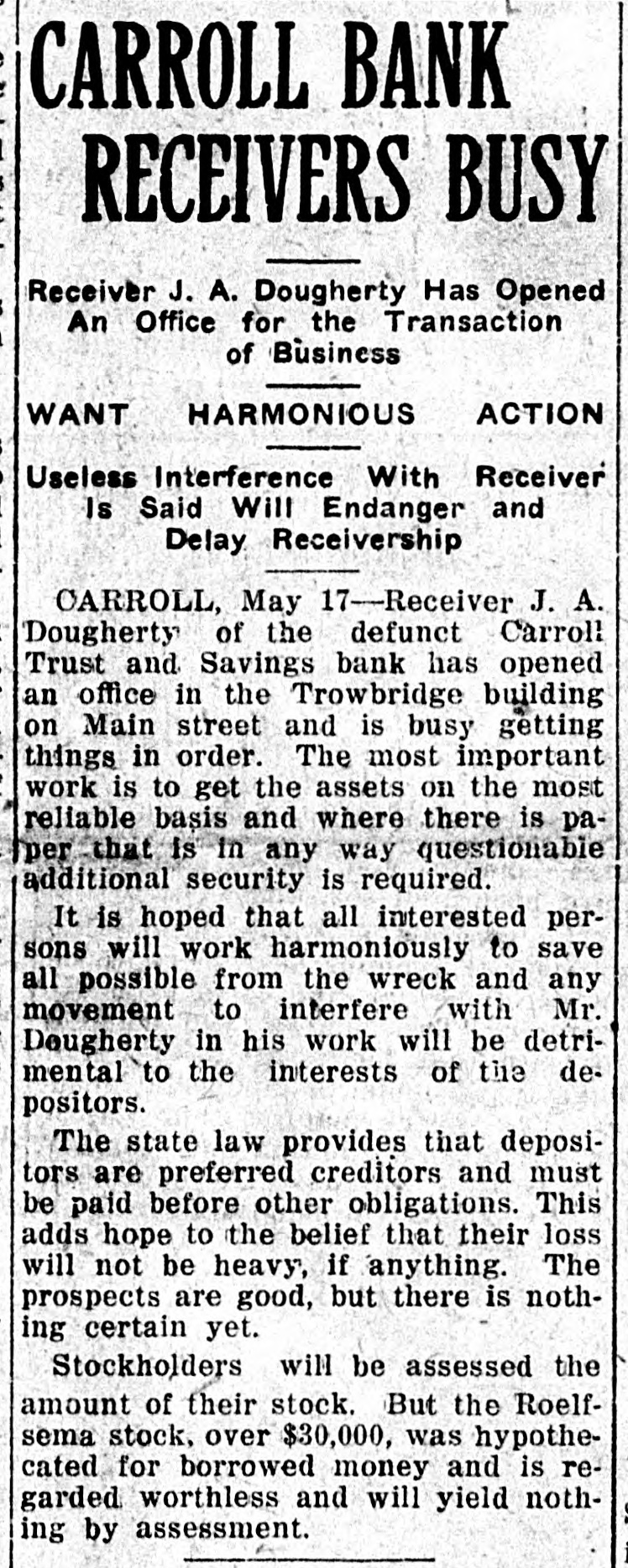 CARROLL BANK RECEIVERS BUSY Receiver J. A. Dougherty Has Opened An Office for the Transaction of Business ACTION WANT HARMONIOUS Useless Interference With Receiver Is Said Will Endanger and Delay Receivership CARROLL, May 17-Receiver J. A. Dougherty of the defunct Carroll Trust and Savings bank has opened an office in the Trowbridge building on Main street and is busy getting things in order. The most important work is to get the assets on the most reliable basis and where there is paper that is in any way questionable additional security is required. It is hoped that all interested persons will work harmoniously to save all possible from the wreck and any movement to interfere with Mr. Dougherty in his work will be detrimental to the interests of the depositors. The state law provides that depositors are preferred creditors and must be paid before other obligations. This adds hope to the belief that their loss will not be heavy, if anything. The prospects are good, but there is nothing certain yet. Stockholders will be assessed the amount of their stock. But the Roelfsema stock, over $30,000, was hypothecated for borrowed money and is regarded worthless and will yield nothing by assessment.