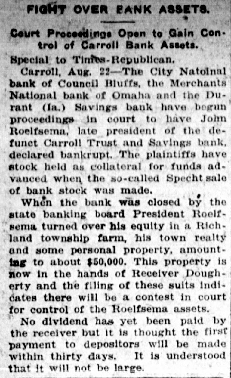 FIGHT OVER BANK ASSETS. Court Proceedings Open to Gain Control of Carroll Bank Assets. Special to Times-Republican. Carroll, Aug. 22-The City Natoinal bank of Council Bluffs, the Merchants National bank of Omaha and the Durant (Ia.) Savings bank have begun proceedings in court to have John Roelfsema, late president of the defunct Carroll Trust and Savings bank, declared bankrupt. The plaintiffs have stock held as collateral for funds advanced when the so-called Specht sale of bank stock was made. When the bank was closed by the state banking board President Roelfsema turned over his equity in a Richland township farm, his town realty and some personal property, amounting to about $50,000. This property is now in the hands of Receiver Dougherty and the filing of these suits indicates there will be a contest in court for control of the Roelfsema assets. No dividend has yet been paid by the receiver but it is thought the first payment to depositors will be made within thirty days. It is understood that it will not be large.