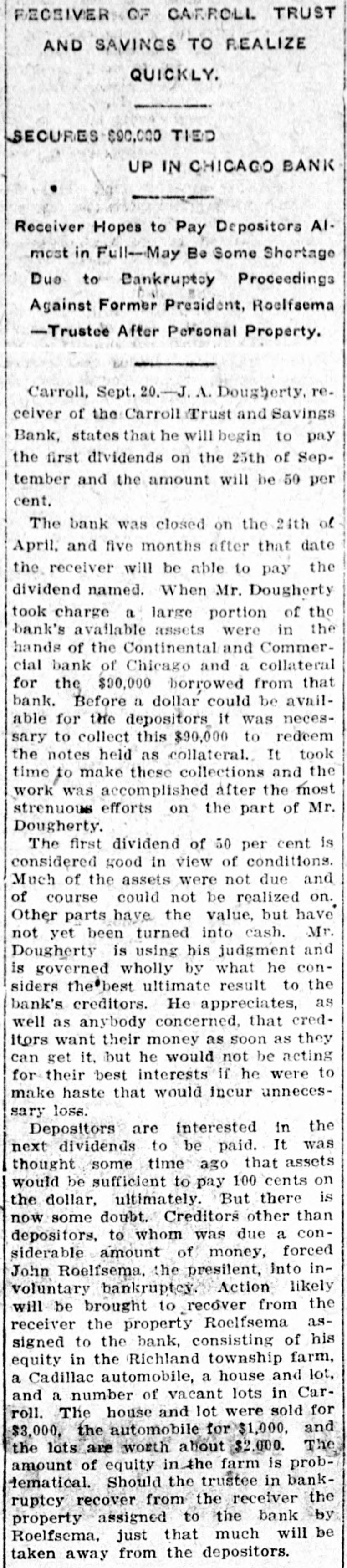 RECEIVER OF CARROLL TRUST AND SAVINGS TO REALIZE QUICKLY. SECURES $90,000 TIED UP IN CHICAGO BANK Receiver Hopes to Pay Depositors AImost in Full-May Be Some Shortage Due to Bankruptcy Proceedings Against Former President, Roelfsema -Trustee After Personal Property. Carroll, Sept. 20.-J. A. Dougherty, recelver of the Carroll Trust and Savings Bank, states that he will begin to pay the first dividends on the 25th of September and the amount will be 50 per cent. The bank was closed on the 24th of April, and five months after that date the receiver will be able to pay the dividend named. When Mr. Dougherty took charge a large portion of the bank's available assets were in the hands of the Continental and Commercial bank of Chicago and a collateral for the $30,000 borrowed from that bank. Before a dollar could be available for the depositors it was necessary to collect this $90,000 to redeem the notes held as collateral. It took time to make these collections and the work was accomplished after the most strenuous efforts on the part of Mr. Dougherty. The first dividend of 50 per cent is considered good in view of conditions. Much of the assets were not due and of course could not be realized on. Other parts have the value, but have not yet been turned into cash. Mr. Dougherty is using his judgment and is governed wholly by what he considers the'best ultimate result to the bank's creditors. He appreciates, as well as anybody concerned, that creditors want their money as soon as they can get it. but he would not be acting for their best interests if he were to make haste that would incur unnecessary loss. Depositors are interested in the next dividends to be paid. It was thought some time ago that assets would be sufficient to pay 100 cents on the dollar, ultimately. But there is now some doubt. Creditors other than depositors, to whom was due a considerable amount of money, forced John Roelfsema, the presilent, into involuntary bankruptcy. Action likely will be brought to recover from the receiver the property Roelfsema assigned to the bank, consisting of his equity in the Richland township farm, a Cadillac automobile, a house and lot, and a number of vacant lots in Carroll. The house and lot were sold for $3,000, the automobile for $1,000, and the lots are worth about $2,000. The amount of equity in the farm is probtematical. Should the trustee in bankruptcy recover from the receiver the property assigned to the bank by Roelfsema, just that much will be taken away from the depositors.