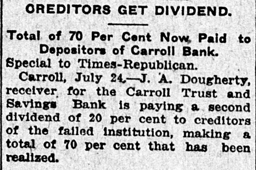OREDITORS GET DIVIDEND. Total of 70 Per Cent Now Paid to Depositors of Carroll Bank. Special to Times-Republican. Carroll, July 24,-J. A. Dougherty, receiver for the Carroll Trust and Savings Bank is paying a second dividend of 20 per cent to creditors of the failed institution, making a total of 70 per cent that has been realized.