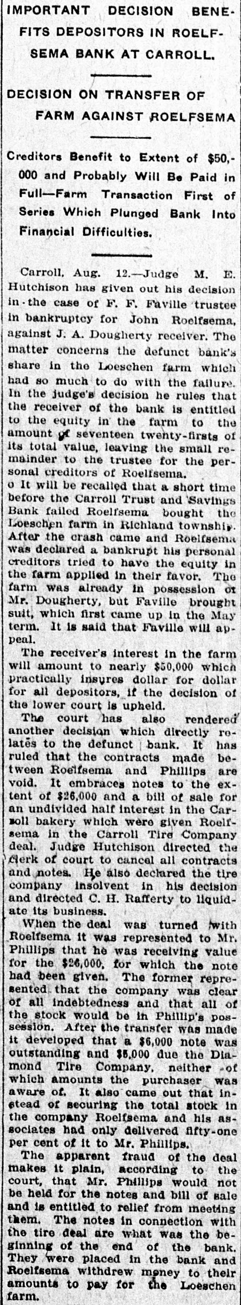 IMPORTANT DECISION BENEFITS DEPOSITORS IN ROELFSEMA BANK AT CARROLL. DECISION ON TRANSFER OF FARM AGAINST ROELFSEMA Creditors Benefit to Extent of $50,000 and Probably Will Be Paid in Full-Farm Transaction First of Series Which Plunged Bank Into Financial Difficulties. Carroll, Aug. 12.-Judge M. E. Hutchison has given out his decision in the case of F. F. Faville trustee in bankruptcy for John Roelfsema, against J. A. Dougherty receiver. The matter concerns the defunct bank's share in the Loeschen farm which had so much to do with the failure. In the judge's decision he rules that the receiver of the bank is entitled to the equity in the farm to the amount ge seventeen twenty-firsts of its total value, leaving the small remainder to the trustee for the personal creditors of Roelfsema. o It will be recalled that a short time before the Carroll Trust and Savings Bank failed Roelfsema bought the Loeschen farm in Richland township. After the crash came and Roelfsema was declared a bankrupt his personal creditors tried to have the equity in the farm applied in their favor. The farm was already in possession of Mr. Dougherty, but Faville brought suit, which first came up in the May term. It is said that Faville will appeal. The receiver's interest in the farm will amount to nearly $50,000 which practically insures dollar for dollar for all depositors, if the decision of the lower court is upheld. The court has also rendered another decision which directly relates to the defunct I bank. It has ruled that the contracts made between Roelfsema and Phillips are void. It embraces notes to the extent of $26,000 and a bill of sale for an undivided half interest in the Carmoll bakery which were given Roelfsema in the Carroll Tire Company deal. Judge Hutchison directed the clerk of court to cancel all contracts and notes. He also declared the tire company insolvent in his decision and directed C. H. Rafferty to liquidate its business. When the deal was turned /with Roelfsema it was represented to Mr. Phillips that he was receiving value for the $26,000. for which the note had been given. The former represented that the company was clear of all indebtedness and that all of the stock would be in Phillip's possession. After the transfer was made it developed that a $6,000 note was outstanding and $5,000 due the Diamond Tire Company, neither of which amounts the purchaser was aware of. It also came out that instead of securing the total stock in the company Roelfsema and his associates had only delivered fifty-one per cent of It to Mr. Phillips. The apparent fraud of the deal makes it plain, according to the court, that Mr. Phillips would not be held for the notes and bill of sale and is entitled to relief from meeting them. The notes in connection with the tire deal are what was the beginning of the end of the bank. They were placed in the bank and Roelfsema withdrew money to their amounts to pay for the Loeschen