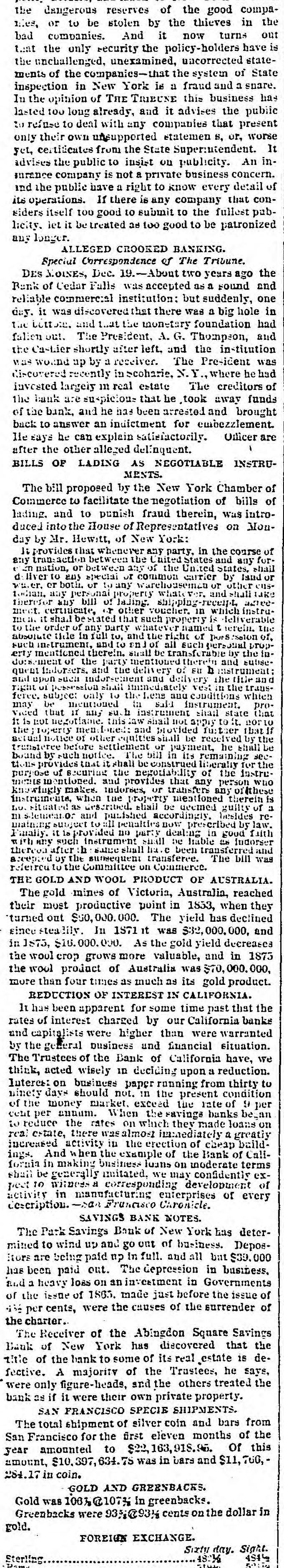dangerous reserves of the good compa- the the or to be stolen by the thieves in out nes, bad companies. And it now turns that the only security the policy-holders have is the unchallenged, unexamined, uncorrected statements of the companies-that the system of State inspection in New York is a fraud and a snare. has opinion of THE TRIBUNE this business 100 already, and it advises to deal with any companies In lasted 20 refuse the long that the or, present public worse only their own unsupported statement S, It yet, certificates from the State Super:utendent. inadvises the public to insist on publicity. An surance company is not a private business concern. and the public have a right to know every detail of its operations. If there is any company that considers itself 100 good to submit to the fullest pablicity. let it be treated as 100 good to be patronized any longer. ALLEGED CROOKED BANKING. Special Correspondence of The Tribune. MOINES, Dec. About two years ago the Rank DES of Cedar Falls was accepted as a Found and reliable commercial institution: but suddenly, one day. it was discovered that there was a big hole in the Little and that the monetary foundation and had fallen out. The President, A. G. Thompson, the Ca-Lier shortly after left. and the in-titution wound up by a receiver. The Pre-ident was The Ni-covered was recently in Scoharie, N.Y. where creditors e had of invested largely in real estate the Bank are suspicious that he took away funds of the bank, and he has been arrested and brought back to answer an indictment for embezzlement. are lle says he can explain satisfactorily. Officer after the other alleged delinquent. BILLS OF LADING AS NEGOTIABLE INSTRUMENTS. The bill proposed by the New York Chamber of of Commerce to facilitate the negotiation of bills lading. and to punish fraud therein, was introduced into the House of Representatives on Monday by Mr. Hewitt, of New York: provides that whenever party. in the course for- of It transaction between the United States and States. any shall any or between any of the United or to any special or common carrier to any warehousement or property whate water. today. d liver nation, er any both. persuns or and by other shall land agree- take cusbill of lading. shippingtherefor any or other voucher. in which be stated that such property of any party whatever named t mon. meet. to the it certificate, order shad is herein. deliverable instru- the in full to, and the right of such instrument. and to by the mentioned therein. shall be of the party mentioned therein absolute erty title unlof all transferable such personal instrument; and subse- LTOPquent document inderects. indure: and the delivery delivery of EU h the fitle and and upon such shall immediately vest in the which trausright of subject only 10 the Lens and conditions proferee. in suid instrument. that if any su. h instrument negotianie, this law shall not apply to that may vieed not be mentioned shall fusteer state it. porto that 11 is men Issued: and provided before settlement or payment, actual Notice trunsferee the property of other equities The bill shall in its be remaining received he shall by sec- the the be tions boand provides by of such securing that notice. it shall the negotiability be construed liberally of the instru- for purpose mentioned. and provides that any person who ments makes. endorses, or transfers any oilthese when tue property as Reserved. eliail be deemed and pulished accord dingly. subject to all penalties now maining knowingly Lu. instruments, stetuento: situated meationed prescribed in besides good guilty therein by fifth law. of re- is a such instrument small be as a Finally. it 1s provided :h same shall no party has c dealing been liable transferred Indorser bill was accepted thereoa after by the surenquent transferee. Commerce. The refeircu to the committee on THE GOLD AND WOOL PRODUCT OF AUSTRALIA. The gold mines of Victoria, Australia, reached their most productive point in 1853, when they turned out $50,000.000. The yield has declined since In 1S71 it was $32,000,000, and in 1973, $16.000.000. As the gold yield decreases the wool crop grows more valuable, and in 1873 the woul product of Australia was $70,000.000, more than four times as much as its gold product. REDUCTION OF INTEREST IN CALIFORNIA. It has been apparent for some time past that the rates of interest charged by our California banks and capitalists were higher than were warranted the general business and funcial situation. The by Trustees of the Bank of California have, we think, acted wisely in deciding upon a reduction. Interest on business paper running from condition thirty to ninety days should not. in the present of the money market. exceed the rate of 9 per annum. When the savings began the rates on which they there was almosI a real cent to reduce estate, per immediately made banks loans on greatly build activity in the erection of cheap And when the example of the making business luans on ings. formin increased in moderate confidently Bank of terms Call- exshall be generally imitated, we may 10 witness # corresponding development of peet activity in manufacturing enterprises of every description. Francisco Caronicle. SAVINGS BANK NOTES. The Park Savings Bank of New York has determined to wind up and go ont of business. DeposRors are being paid np In full. and all but $39,000 has been paid out. The depression in business. and a heavy loss on an investment in Governments the issue of 1865. made just before the issue of of 413 per cents, were the causes of the surrender of the charter. The Receiver of the Abingdon Square Savings of New York has discovered that de- the title Bank of the bank to some of its real estate is : fective. A majority of the Trastees, he says, the were only figure-heads, and the others treated bank as if it were their own private property. SAN FRANCISCO SPECIE SHIPMENTS. total shipment of silver coin and bars of from the The Francisco for the fi