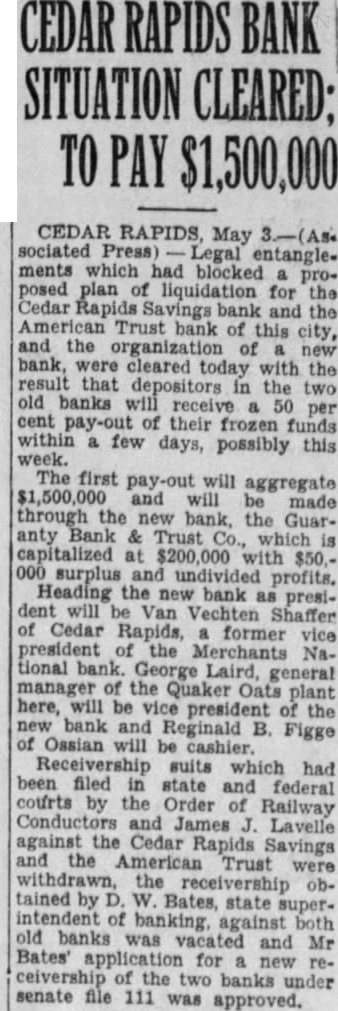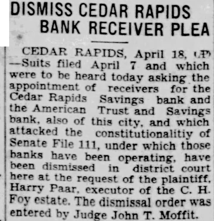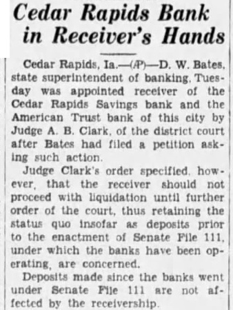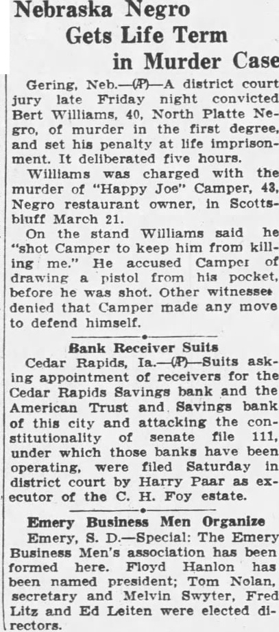Nebraska Negro Gets Life Term in Murder Case Gering, district court jury late Friday night convicted Bert Williams, 40, North Platte Negro, of murder in the first degree, and set his penalty life imprisonment. It deliberated five hours. Williams was charged with the murder "Happy Joe" Camper, Negro restaurant owner, in Scottsbluff March On the Williams said he "shot Camper to keep him from killing me." He accused Camper of drawing pistol from pocket, before he was shot. Other witnessee denied that Camper made any move to defend himself. Bank Receiver Suits Cedar Rapids, asking appointment of receivers for the Cedar Rapids Savings bank and the American Trust and Savings bank of this and attacking the stitutionality senate file 111, under which those banks have been operating, were filed Saturday in district court by Harry Paar as executor of the H. Foy estate. Emery Business Men Organize Emery, The Emery Business Men's association has been formed here. Floyd Hanlon has been named president; Tom Nolan, secretary Melvin Swyter, Litz and Ed Leiten were elected directors.