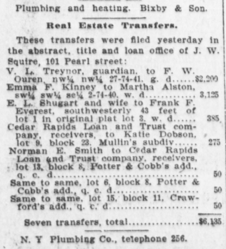 Plumbing and heating. Bixby & Son. Real Estate Transfers. These transfers were filed yesterday in the abstract, title and loan office of J. W. Squire, 101 Pearl street: V. L. Treynor, guardian. to F. W. $2,200 Ouren nw½ nw½ 27-74-41. g. d Emma F. Kinney to Martha Alston, 3,125 swis sw½ se 1/4 2-74-40, W. d E. L. Shugart and wife to Frank F. Everest, southwesterly 43 feet of 385 lot 1 in original plat lot 3. W. d Cedar Rapids Loan and Trust company, receivers, to Katie Dobson, 275 lot 9, block 23. Mullin's subdiv Norman E. Smith to Cedar Rapids Loan and Trust company. receivers, lot 13, block 8, Potter & Cobb's add. 50 q. c. d Same to same, lot 6, block 8, Potter & 50 Cobb's add., q. e. d Same to same, lot 15, block 11, Craw50 ford's add., q. c,' d $6,135 Seven transfers, total N. Y Plumbing Co., telephone 256.