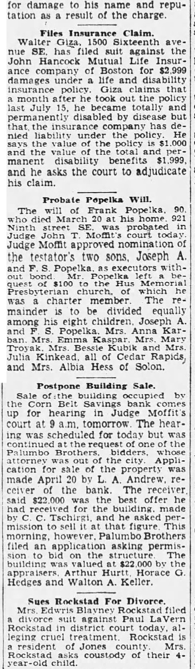 Probate Popelka Will. The will of Frank Popelka, 90 who died March 20 his home. 921 Ninth street SE. was probated Judge John Moffit's court Judge Moffit approved nomination of the testator's two sons. Joseph A. and Popelka executors without bond Popelka quest of $100 to Hus Memorial church. which he was a charter member The remainder is to be divided equally among his eight children. Joseph A. and S. Popelka Mrs. Anna Karban. Mrs. Emma Mrs. Mary and Mrs. Julia Kinkead, all of Cedar Rapids, and Mrs. Albia Hess of Solon.