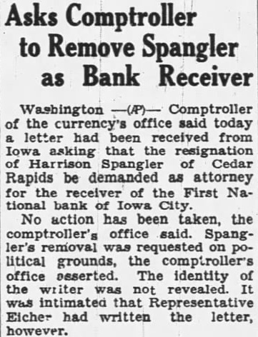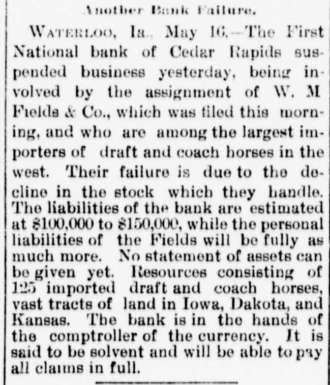 Another Bank Failure. WATERLOO, 1a., May 16.-The First National bank of Cedar Rapids suspended business yesterday, being in volved by the assignment of W. M Fields & Co., which was tiled this morning, and who are among the largest importers of draft and coach horses in the west. Their failure is due to the decline in the stock which they handle. The liabilities of the bank are estimated at $100,000 to $150,000, while the personal liabilities of the Fields will be fully as much more. No statement of assets can be given yet. Resources consisting of 125 imported draft and coach horses, vast tracts of land in Iowa, Dakota, and Kansas. The bank is in the hands of the comptroller of the currency. It is said to be solvent and will be able to pay all claims in full.
