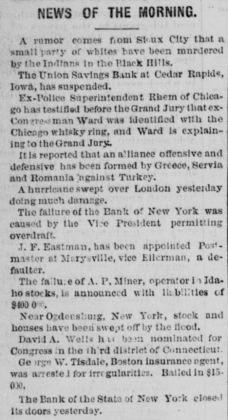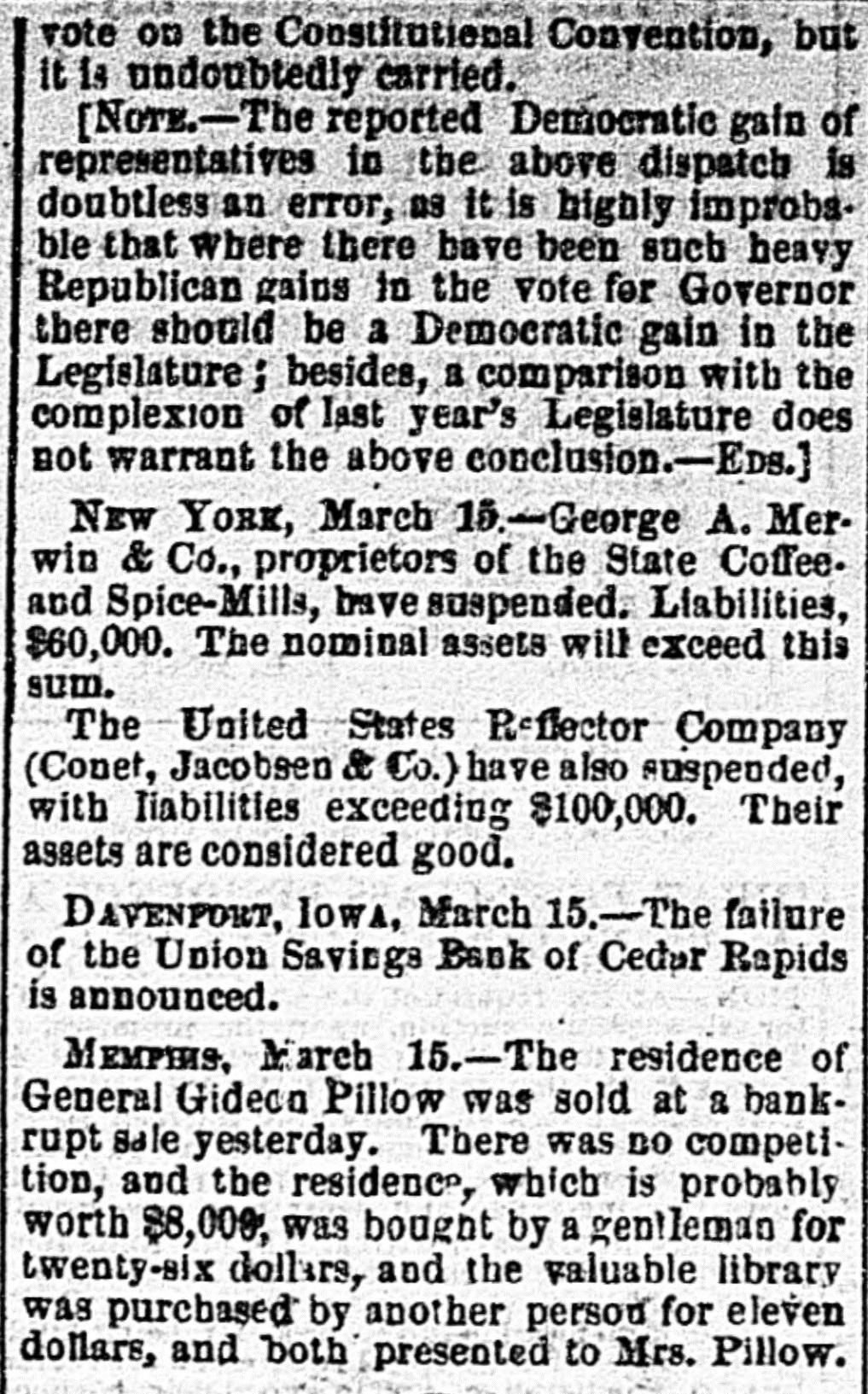 vote on the Constitutional Convention, but it is undoubtedly carried. [NOTE.-The reported Democratic gain of representatives in the above dispatch is doubtless an error, as it is highly improbsble that Where there have been such heavy Republican gains in the vote for Governor there should be a Democratic gain in the Legislature; besides, a comparison with the complexion of last year's Legislature does not warrant the above conclusion.-EDS.] NEW YORK, March 15.-George A. Merwin & Co., proprietors of the State Coffee. and Spice-Mills, have suspended. Liabilities, $60,000. The nominal assets will exceed this sum. The United States Reflector Company (Conet, Jacobsen & Co.) have also suspended, with liabilities exceeding $100,000. Their assets are considered good. DAVENPORT, IOWA, March 15.-The failure of the Union Savings Bank of Cedur Rapids is announced. MEMPHIS. March 15.-The residence of General Gideca Pillow was sold at a bankrupt sale yesterday. There was no competition, and the residence, which is probably worth $8,000, was bought by a gentleman for twenty-six dollars, and the valuable library was purchased by another person for eleven dollars, and both presented to Mrs. Pillow.