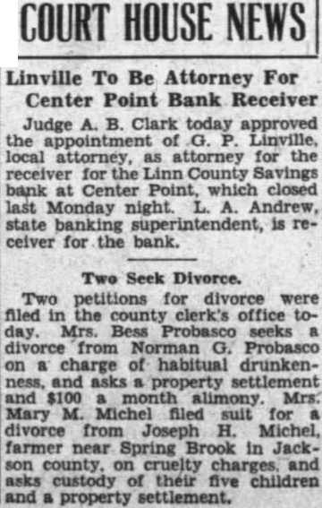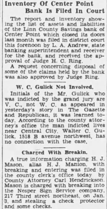 Bank Receiver Sues. L. A. Andrew, state banking superintendent, bank receiver, requesting number of judgments notes. As receiver of the Linn County Savings bank at Center Point, he asks decrees in promissory note action against Ritze W. Ritze for $600; Ritze for for $40 $324.33. As receiver of the Kenwood Savings bank he seeks judgments on notes against Helm for Arthur Fox for total of Ezra Helm Amelia Helm for $500; and Helm and Ezra Helm for $300. ceiver of the Corn Belt Savings bank seeks judgment on note against Sarah Braverman and asks that be established as lien against certain securities. Other note cases and judgments asked Allen Brothers against George Oxley Ruth OxHunting Lumber company against Hawkeye Casket company. $395.36 and and Butler against Clifford Doe, $245. Hurnevich Brothers, Bernard Hurnevich and Peter Hurnevich judgment of $180 against A. Dedek and Frances Dedek on an alleged protested check.