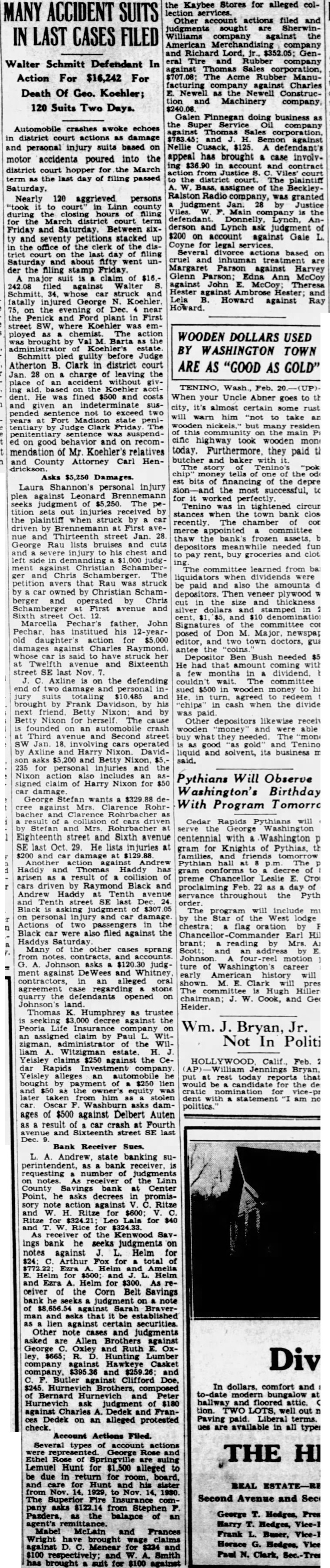 Laura Shannon's personal injury plea against Leonard Brennemann for seeks judgment of The petition sets injuries received by the plaintiff when struck by car driven by Brennemann at First avenue Thirteenth street Jan. 28 George Rau lists bruises and cuts and injury to his chest and side in demanding judgment Christian SchamberThe petition avers that Rau was struck by car owned by Christian Schamberger and operated Chris First avenue and Marcella Pechar's father. John Pechar. has institued his daughter's action for $5,000 damages against Charles Raymond. whose said have struck her at Twelfth avenue and Sixteenth street SE last Axline on the defending end of two damage and personal jury suits totaling and brought by Frank Davidson, by his next friend. Betty Nixon: and by Betty Nixon for herself. The cause founded on an automobile crash Third avenue Second street Jan. 18, involving cars operated by Axline and Harry Nixon. Davidand Betty Nixon, 235 for personal injuries and the Nixon action includes an signed claim of Harry Nixon for $50 car damage. George Stefan wants 88 against Clarence Rohrbacher and Clarence Rohrbacher result collision of Stefan and Mrs. Rohrbacher Eighteenth street and Sixth avenue SE last Oct. 29. He lists injuries at $200 and car damage Another action Andrew Haddy Thomas Haddy has arisen result collision of cars by Raymond Black and Andrew Haddy at Tenth avenue SE last Black on damage. Actions passengers in the Black car were also filed against the Haddys Saturday Many other cases sprang from notes, and Johnson asks $120.30 judgment against and Whitney, contractors, in alleged oral agreement regarding stone quarry the defendants opened on Johnson's Thomas Humphrey as trustee seeking $3,000 decree against the Peoria Life Insurance company on an claim by Paul Witzigman, the William Witzigman Yeisley claims $250 against the Cedar Rapids Investment Yeisley alleges an automobile he bought by payment of $250 lien and $50 the owner's equity taken from him as stolen Oscar Washburn asks damages of $500 against Delbert Auten result car crash at Fourth Sixteenth street SE last