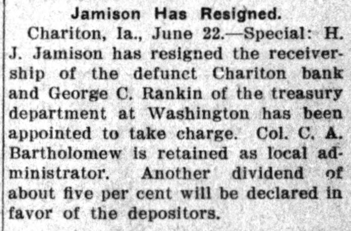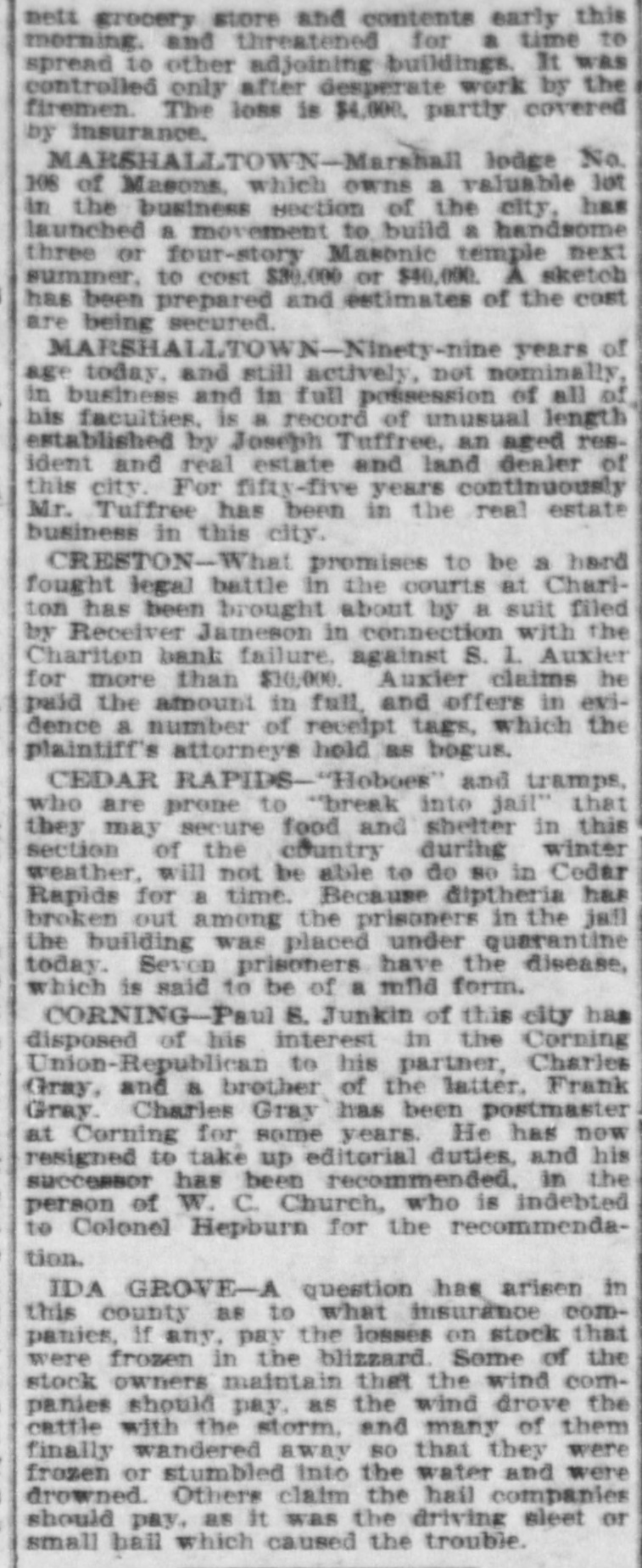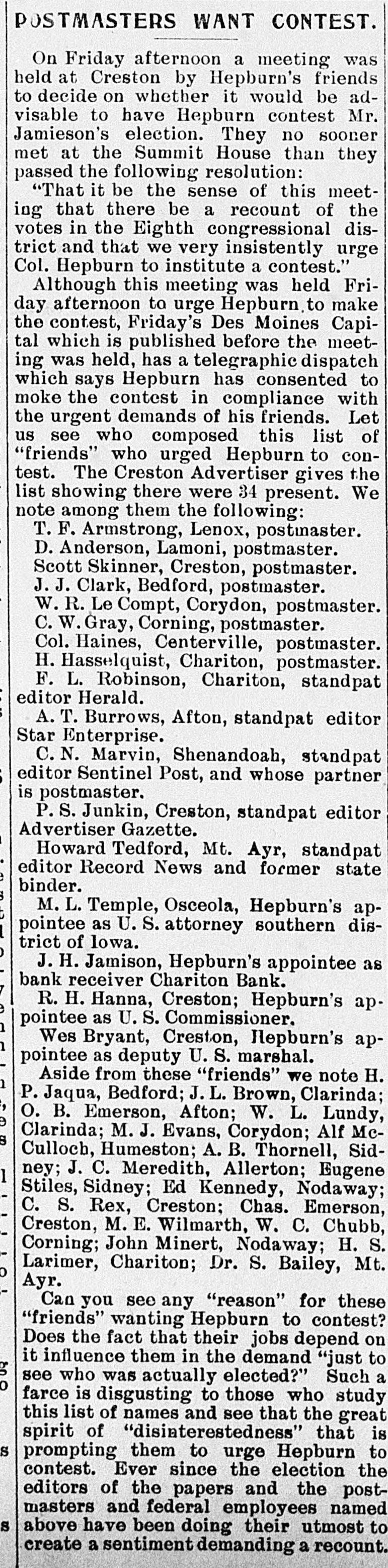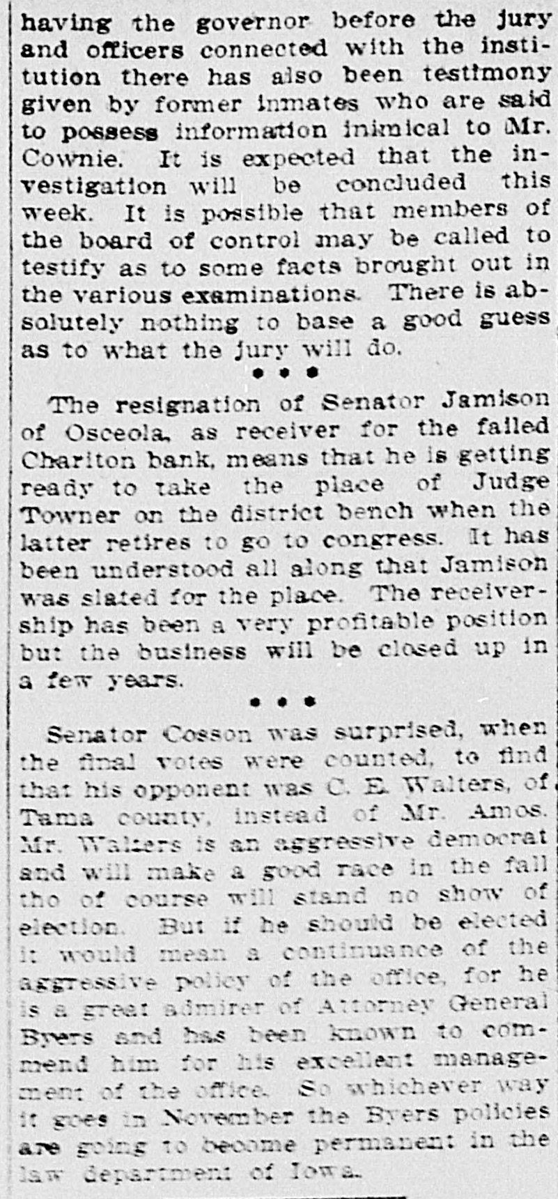 COUNTY ATTORNEYS MEET Small Attendance at Annual Session in Des Moines. INDIANAPOLIS MAN TSSAULTED While Fishing Along Coon River He is Fatally Stabbed-Jamison Resigns as Receiver of Chariton Bank. (From a Staff Correspondent.) DES MOINES, June 22.-(Special Telegram.)-The annual convention of the County Attorneys' association of Iowa began here today, with a very small attendance. Judge De Graff of the local court, who has been a member of the association several years, delivered an address of welcome, and the response was by County Attorney Egermeyer of Marshall county. President Seneca Cornell gave the annual address, but the remainder of the program was postponed until tomorrow, when the State Bar association will also convene. Megroes Assault Smith. Harry L. Smith of Indianapolis, Ind., was engaged in fishing along the Coon river in the western part of the city today when he was set upon by three negroes. In the melee which followed Smith was fatally stabbed. His assailants got away. Jamison Resigns. J. H. Jamison, receiver for the defunct Chariton bank, has resigned. G. C. Rakin of Washington has been appointed to succeed Jamison. A dividend of 5 per cent has been declared. Jamison will be nominated for judge, to succeed Towner, when the latter resigns to enter congress. Some Official Figures. The official canvass shows that only the state superintendency will go to the convention. David J. Palmer and Clifford Thorne, both of Washington, Ia., have been nominated for state railroad commissioner. Threatened injunction proceedings by Chris Ottesen of Humboldt against this canvass failed to materialize. When the executive council met, in order to forestall any controversy as to how to decide who was nominated, the council passed a resolution deciding the legal question as to the interpretation of the law, declaring that when the certificate is made out it will be based on 35 per cent of half the total vote and not 35 per cent of the entire vote. This wil shut out any argument on the question before the council. Congressional Vote. The vote in congressional districts was: First District-Brookhart, 4,406; Kennedy, 7,405; Kennedy's majority, 2,999. Democratic: Pollard, 3,554; Gillis, 1,625; Pollard's majority, 1,929. Second District-Charles Grilk, 5,704. Democratic: DeArmand, 3,345; Pepper, 3,404; Pepper's majority, 119. Fourth District-Haugen (republican), 11,927. Murphy (democratic), 3,708. Fifth District-Good (republican), 10,901; Huber (democratic), 2,641. Seventh District-Prouty, 14,122; Hull, 10,855; Prouty's official majority, 3,267. Democratic: Price, 1,483; O'Malley, 1,223; Price's majority, 260. Eighth District-Towner, 8,376; Darrah, 7,498; Towner's official majority, 878. Democratic: Stuart, 1,895; Booth, 1,418; Sankey, 985. Ninth District-Smith, 9,743; Byers, 8,138; Smith's majority, 1,605. Democratic: Cleveland, 2,606; Holsman, 980. Tenth District-Woods, 16,591; Mayne, 4,249; Woods' majority, 12,341. In the other districts there were no contests.