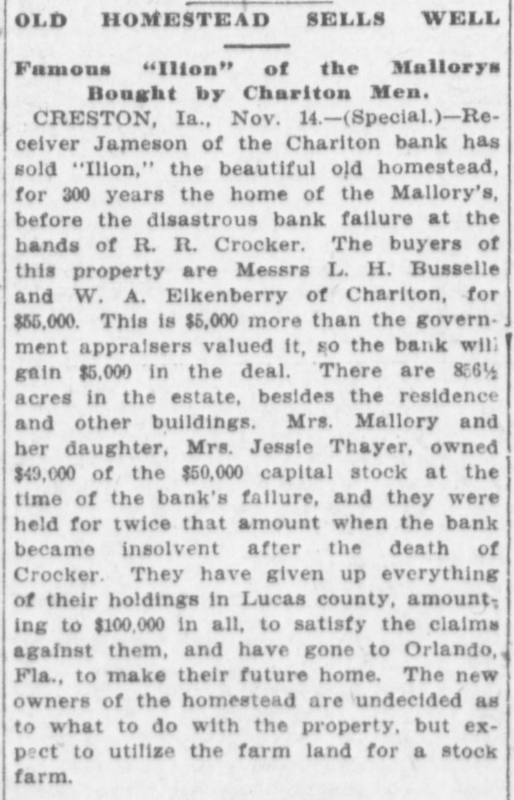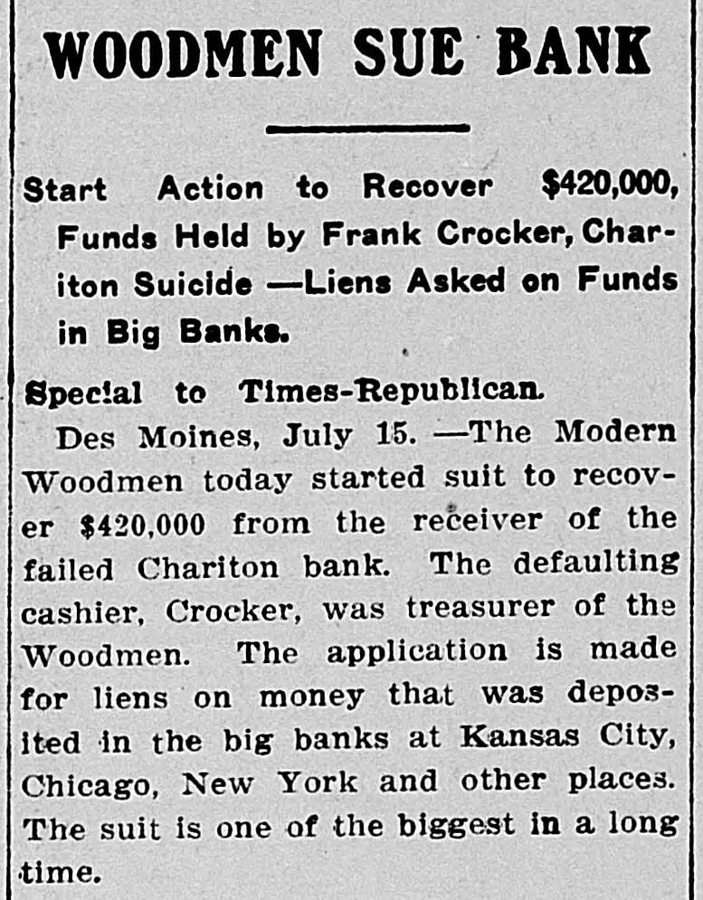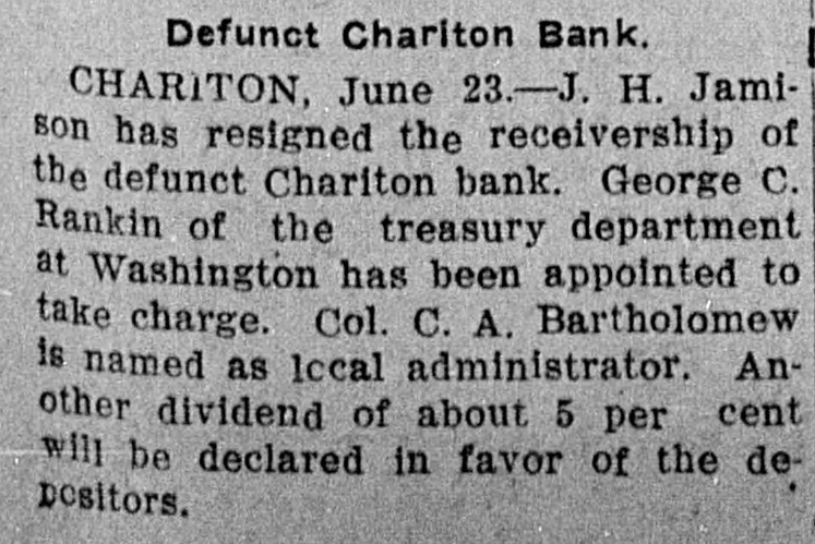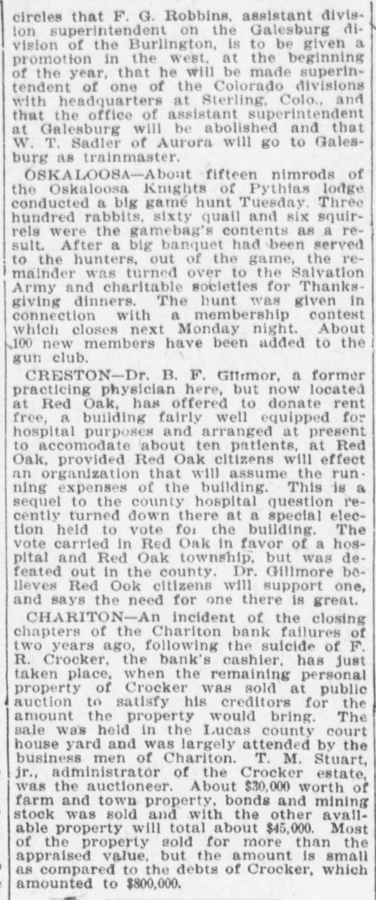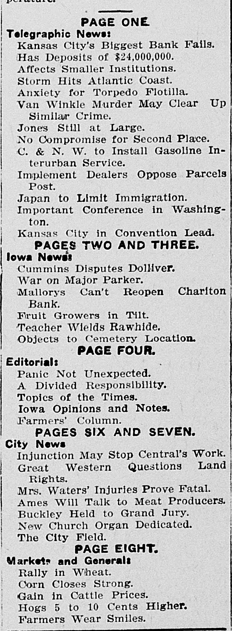 COUNTY ATTORNEYS MEET Small Attendance at Annual Session in Des Moines. INDIANAPOLIS MAN TSSAULTED While Fishing Along Coon River He is Fatally Stabbed-Jamison Resigns as Receiver of Chariton Bank. (From a Staff Correspondent.) DES MOINES, June 22.-(Special Telegram.)-The annual convention of the County Attorneys' association of Iowa began here today, with a very small attendance. Judge De Graff of the local court, who has been a member of the association several years, delivered an address of welcome, and the response was by County Attorney Egermeyer of Marshall county. President Seneca Cornell gave the annual address, but the remainder of the program was postponed until tomorrow, when the State Bar association will also convene. Megroes Assault Smith. Harry L. Smith of Indianapolis, Ind., was engaged in fishing along the Coon river in the western part of the city today when he was set upon by three negroes. In the melee which followed Smith was fatally stabbed. His assailants got away. Jamison Resigns. J. H. Jamison, receiver for the defunct Chariton bank, has resigned. G. C. Rakin of Washington has been appointed to succeed Jamison. A dividend of 5 per cent has been declared. Jamison will be nominated for judge, to succeed Towner, when the latter resigns to enter congress. Some Official Figures. The official canvass shows that only the state superintendency will go to the convention. David J. Palmer and Clifford Thorne, both of Washington, Ia., have been nominated for state railroad commissioner. Threatened injunction proceedings by Chris Ottesen of Humboldt against this canvass failed to materialize. When the executive council met, in order to forestall any controversy as to how to decide who was nominated, the council passed a resolution deciding the legal question as to the interpretation of the law, declaring that when the certificate is made out it will be based on 35 per cent of half the total vote and not 35 per cent of the entire vote. This wil shut out any argument on the question before the council. Congressional Vote. The vote in congressional districts was: First District-Brookhart, 4,406; Kennedy, 7,405; Kennedy's majority, 2,999. Democratic: Pollard, 3,554; Gillis, 1,625; Pollard's majority, 1,929. Second District-Charles Grilk, 5,704. Democratic: DeArmand, 3,345; Pepper, 3,404; Pepper's majority, 119. Fourth District-Haugen (republican), 11,927. Murphy (democratic), 3,708. Fifth District-Good (republican), 10,901; Huber (democratic), 2,641. Seventh District-Prouty, 14,122; Hull, 10,855; Prouty's official majority, 3,267. Democratic: Price, 1,483; O'Malley, 1,223; Price's majority, 260. Eighth District-Towner, 8,376; Darrah, 7,498; Towner's official majority, 878. Democratic: Stuart, 1,895; Booth, 1,418; Sankey, 985. Ninth District-Smith, 9,743; Byers, 8,138; Smith's majority, 1,605. Democratic: Cleveland, 2,606; Holsman, 980. Tenth District-Woods, 16,591; Mayne, 4,249; Woods' majority, 12,341. In the other districts there were no contests.