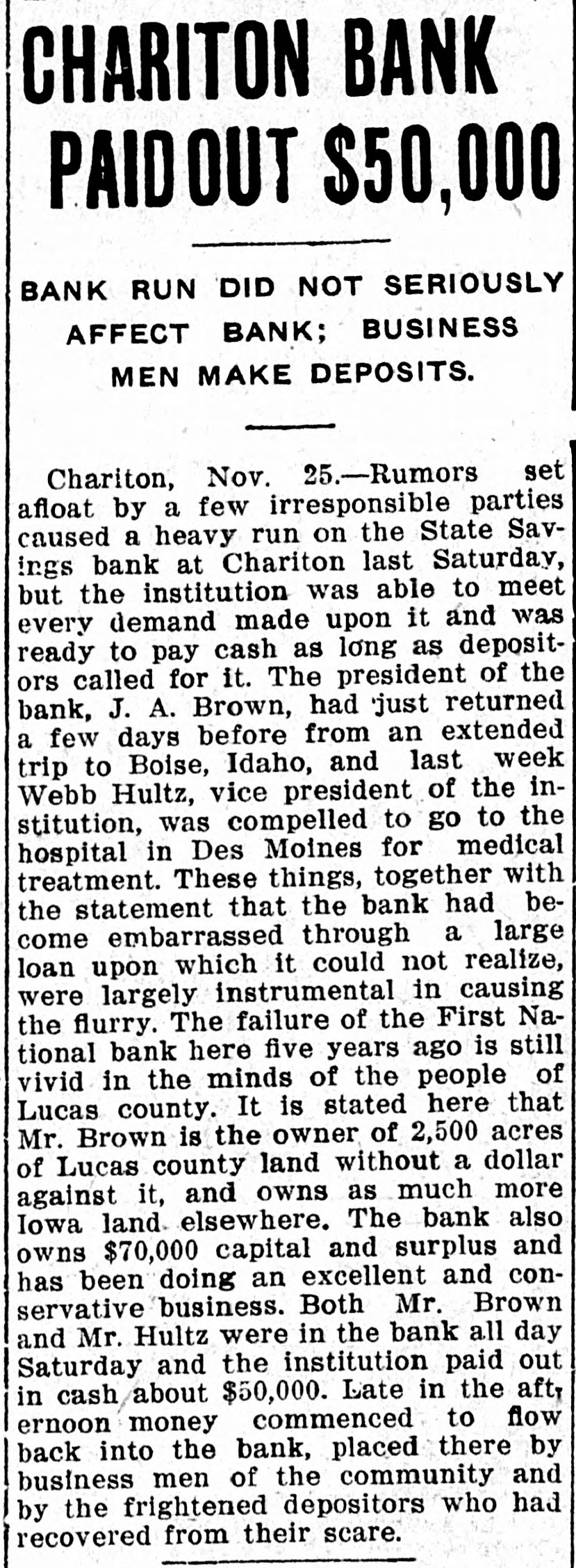 CHARITON BANK PAIDOUT $50,000 bank RUN DID NOT SERIOUSLY AFFECT BANK; BUSINESS MEN MAKE DEPOSITS. Chariton, Nov. 25.-Rumors set afloat by a few irresponsible parties caused a heavy run on the State Savings bank at Chariton last Saturday, but the institution was able to meet every demand made upon it and was ready to pay cash as long as depositors called for it. The president of the bank, J. A. Brown, had just returned a few days before from an extended trip to Boise, Idaho, and last week Webb Hultz, vice president of the institution, was compelled to go to the hospital in Des Moines for medical treatment. These things, together with the statement that the bank had become embarrassed through a large loan upon which it could not realize, were largely instrumental in causing the flurry. The failure of the First National bank here five years ago is still vivid in the minds of the people of Lucas county. It is stated here that Mr. Brown is the owner of 2,500 acres of Lucas county land without a dollar against it, and owns as much more Iowa land elsewhere. The bank also owns $70,000 capital and surplus and has been doing an excellent and conservative business. Both Mr. Brown and Mr. Hultz were in the bank all day Saturday and the institution paid out in cash about $50,000. Late in the aft, ernoon money commenced to flow back into the bank, placed there by business men of the community and by the frightened depositors who had recovered from their scare.