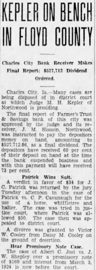 KEPLER ON BENCH FLOYD COUNTY Charles City Bank Receiver Makes Final Report: $527,712 Dividend Charles City Many cases are being of in district court which Judge M. H. Kepler of is presiding The final report of Farmer's Trust & Savings bank of city was approved by the judge and its rewas instructed to pay the depositors money amounting $527,712.86. as final dividend. The depositors received 60 per cent of their deposit on hand at the time the bank with this payment will have received 73 per cent. Patrick Wins Sult. A verdict favor $34 for J. Patrick was returned by the jury Tuesday the case Patrick vs. Cavanaugh for the of whiffletree and halter The case was tried in justice court, where Patrick was allowed $50 case then was appealed to district court divorce was granted to Victor W. Cooley from Daisy Cooley on the ground desertion Hear Promissory Note Case. The of Albert Jost J. W. Shepley over of $160 and interest from March 3, 1924 is now before the court.