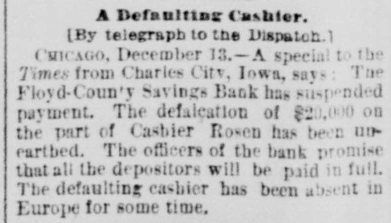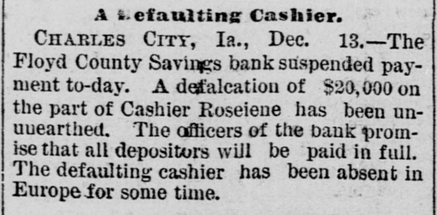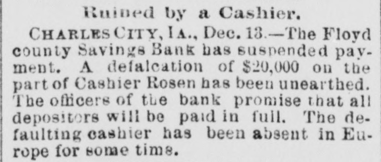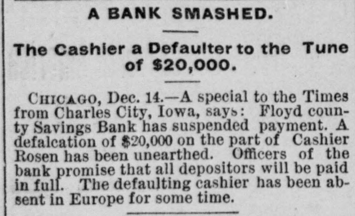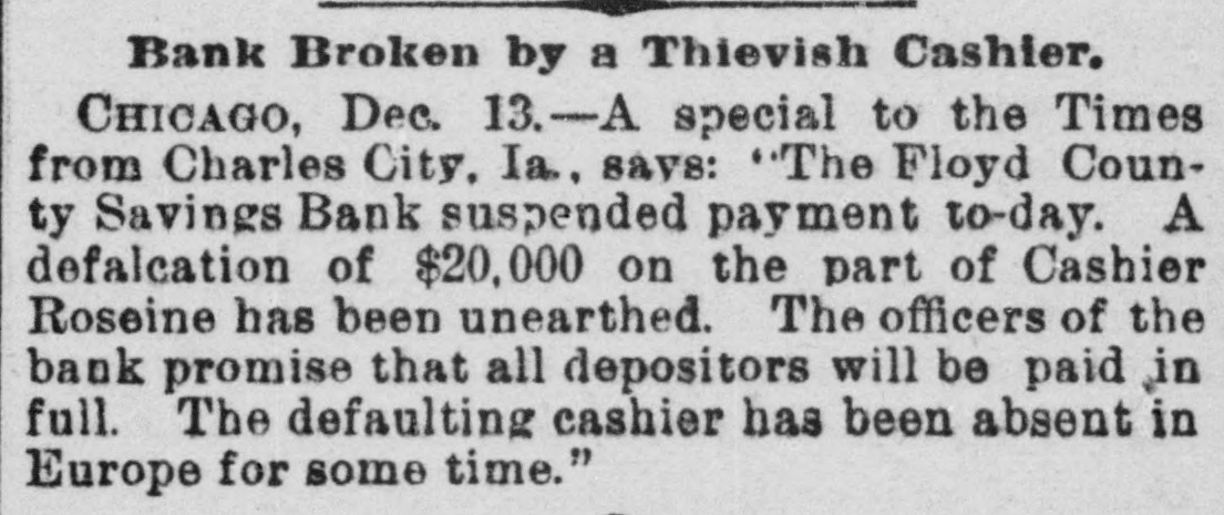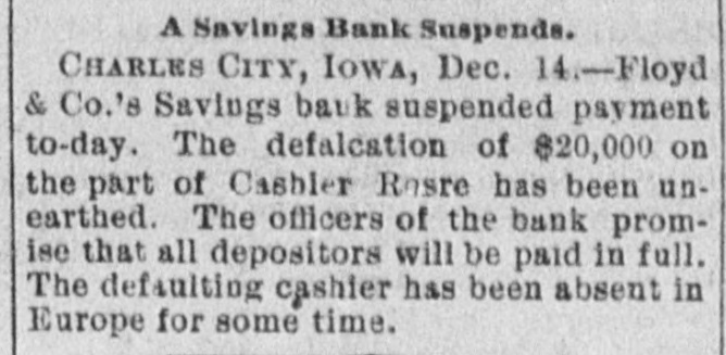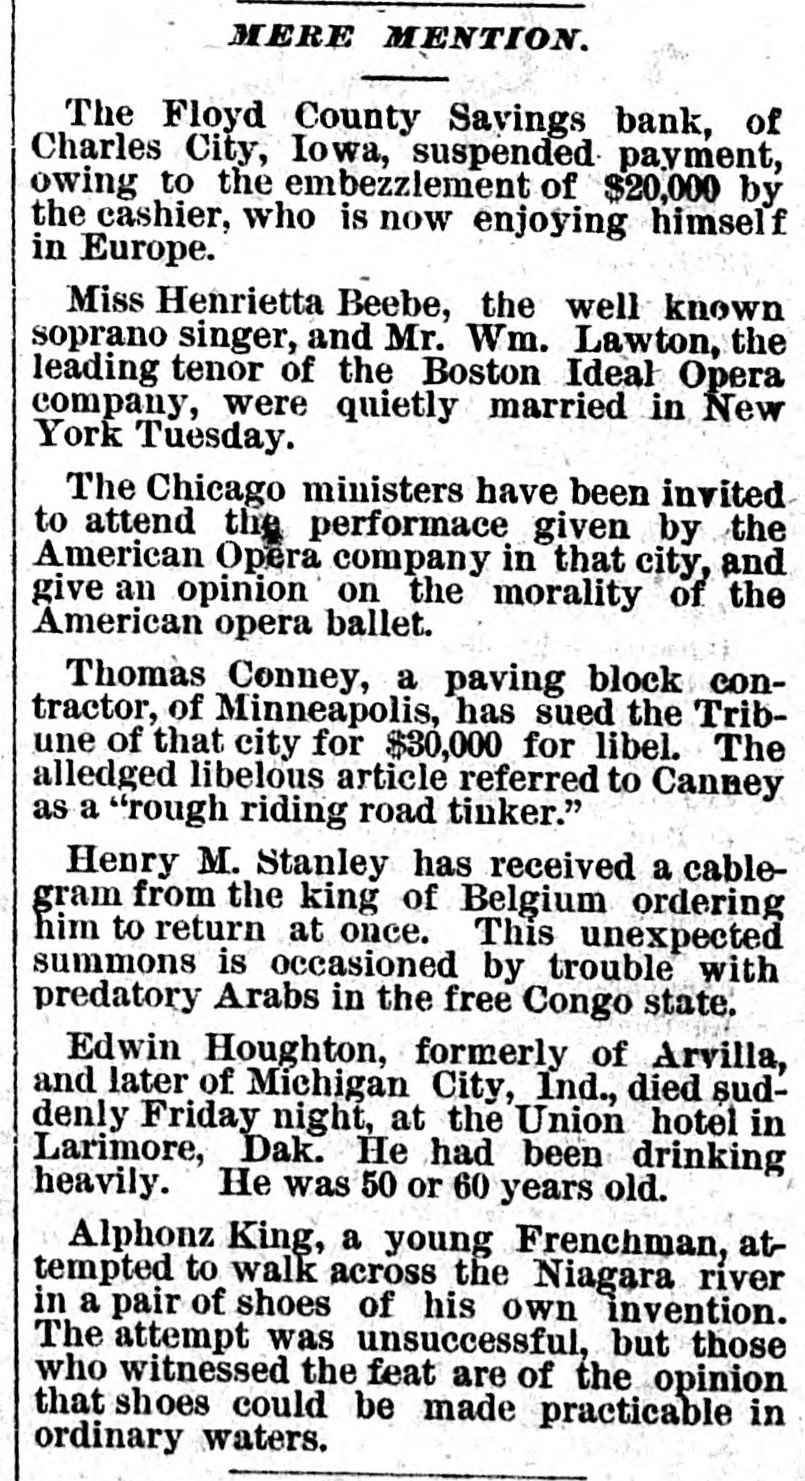 MERE MENTION. The Floyd County Savings bank, of Charles City, Iowa, suspended payment, owing to the embezzlement of $20,000 by the cashier, who is now enjoying himself in Europe. Miss Henrietta Beebe, the well known soprano singer, and Mr. Wm. Lawton, the leading tenor of the Boston Ideal Opera company, were quietly married in New York Tuesday. The Chicago ministers have been invited to attend the performace given by the American Opera company in that city, and give an opinion on the morality of the American opera ballet. Thomas Conney, a paving block contractor, of Minneapolis, has sued the Tribune of that city for $30,000 for libel. The alledged libelous article referred to Canney as a "rough riding road tinker." Henry M. Stanley has received a cablegram from the king of Belgium ordering him to return at once. This unexpected summons is occasioned by trouble with predatory Arabs in the free Congo state. Edwin Houghton, formerly of Arvilla, and later of Michigan City, Ind., died suddenly Friday night, at the Union hotel in Larimore, Dak. He had been drinking heavily. He was 50 or 60 years old. Alphonz King, a young Frenchman, attempted to walk across the Niagara river in a pair of shoes of his own invention. The attempt was unsuccessful, but those who witnessed the feat are of the opinion that shoes could be made practicable in ordinary waters.