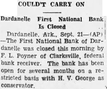 COULD'T CARRY ON Dardanelle First National Bank Is Closed Dardanelle. Ark., Sept. 21-(AP) -The First National Bank of Dardanelle was closed this morning by F. L. Poyner of Clarksville, federal bank receiver. The bank has been open for several months on a restricted basis with H. V. George as conservator.
