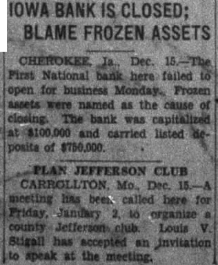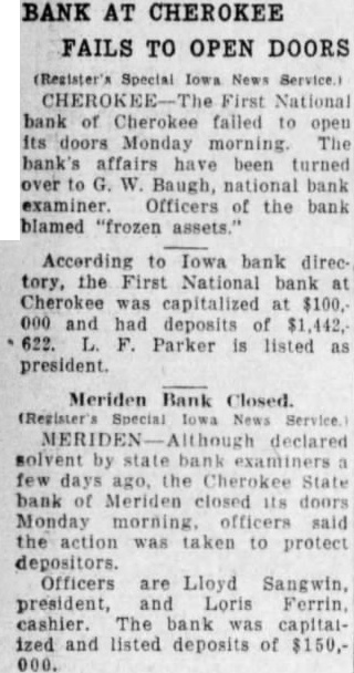 PAGE ONE) least 100 mank failures, based statement of the editor the on Journal of Commerce, is beginning be borne out the report that to four anks crashed on the very day the Daily Worker printed this statement. Three banks, two in Iowa county, with deposits 000,000 closed their doors Monday. First National Bank of CherThe Iowa, with $750,000 in deposits okee, The Cherokee County State failed. Meridan, Iowa, also shut Bank down. Illinois the Ina State Bank smashed.