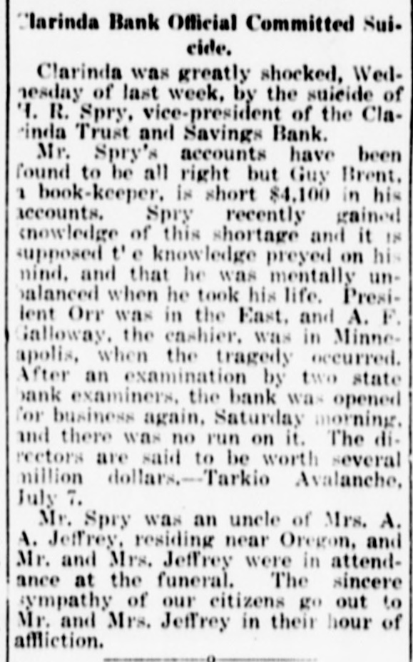 SHORTAGE MAY TOTAL $50,000. No Official Report of Clarinda Bank Investigation Has Been Filed. Special to Times-Republican. Des Moines, July 6.-No official report has as yet been filed with the state banking department as to the result of the investigations of the Clarinda Trust and Savings Bank. It has been unofficially estimated that the shortage in the bank will run from $40,000 to $50,000. No evidence has been found as yet to show where the bulk of this money has gone. The reports of the banking department, however, show that more deposits have been coming into the bank since it was reopened on July 1 than before and the directors have signed a bond to make good personally whatever is necessary.