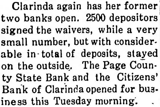 Clarinda again has her former two banks open. 2500 depositors signed the waivers, while a very small number, but with considerable total of deposits, stayed on the outside. The Page County State Bank and the Citizens' Bank of Clarinda opened for bus. iness this Tuesday morning.