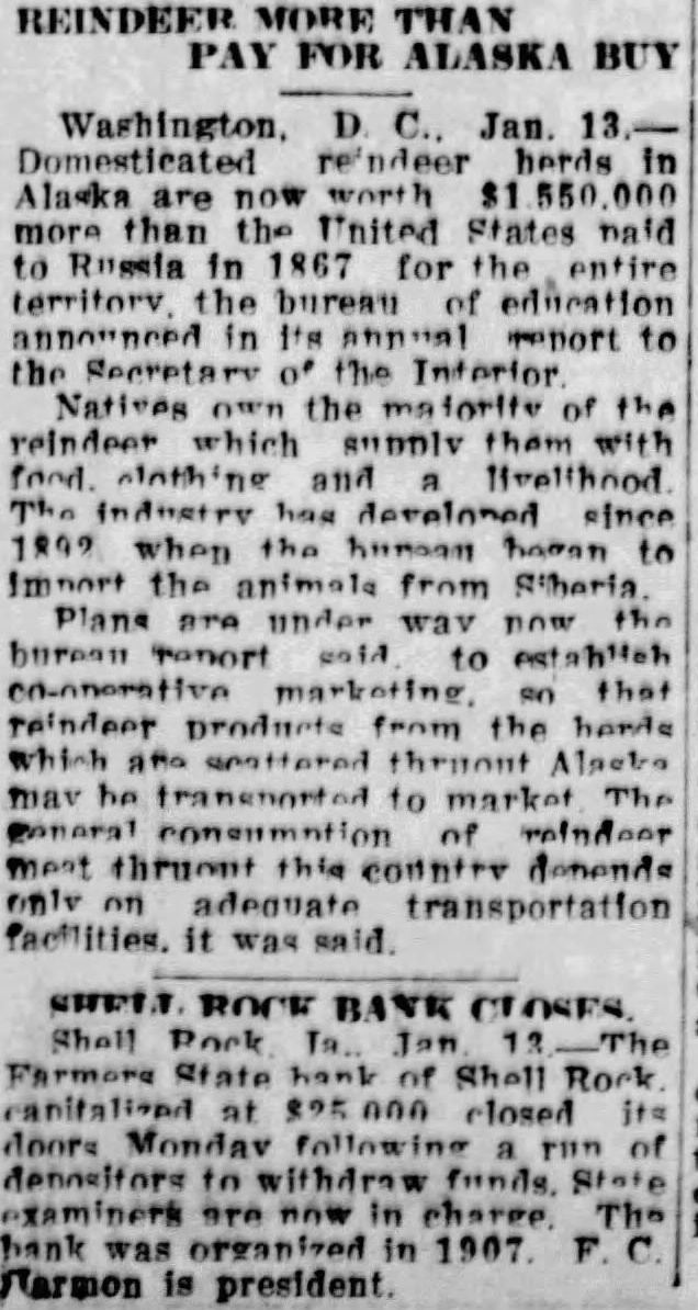 REINDEER MORE THAN PAY FOR ALASKA BUY Domesticated reindeer herds in Alaska are now worth 000 than the United States haid to Russia in 1867 for the entire territory the bureau of education announced in Its Tenort to the Secretary of the Interior Natives 0wn the matority of the reindeer which supply them since 1892 when the human began to import the animals from Sheria Plans are under way now bureau to establish that products from the which seattered thruout may transported to market of only adequate transportation SHELL ROCK BANK Shell State hank Shell Rock canitalized at closed doors Monday depositors to withdraw examiners in The bank was organized in Narmon is president.