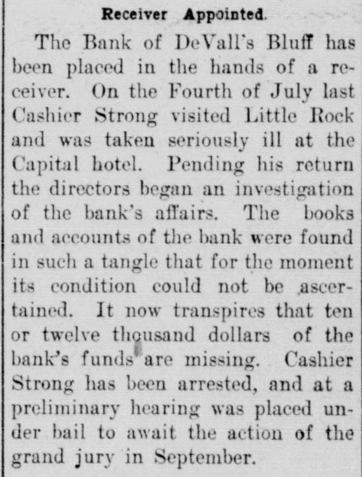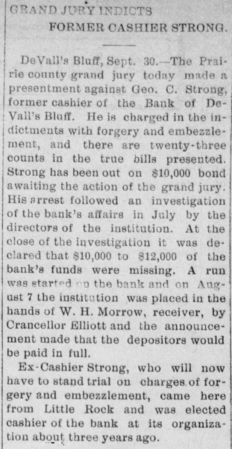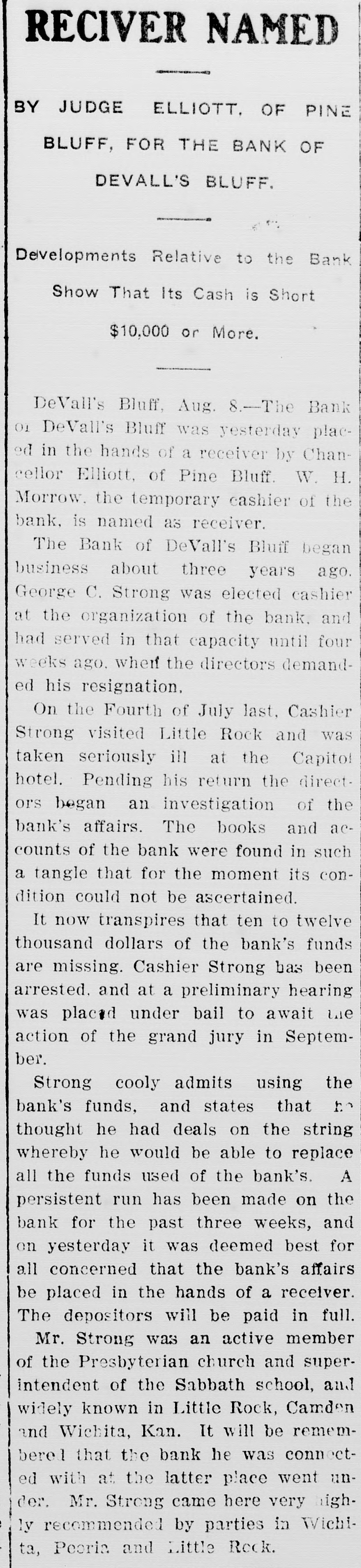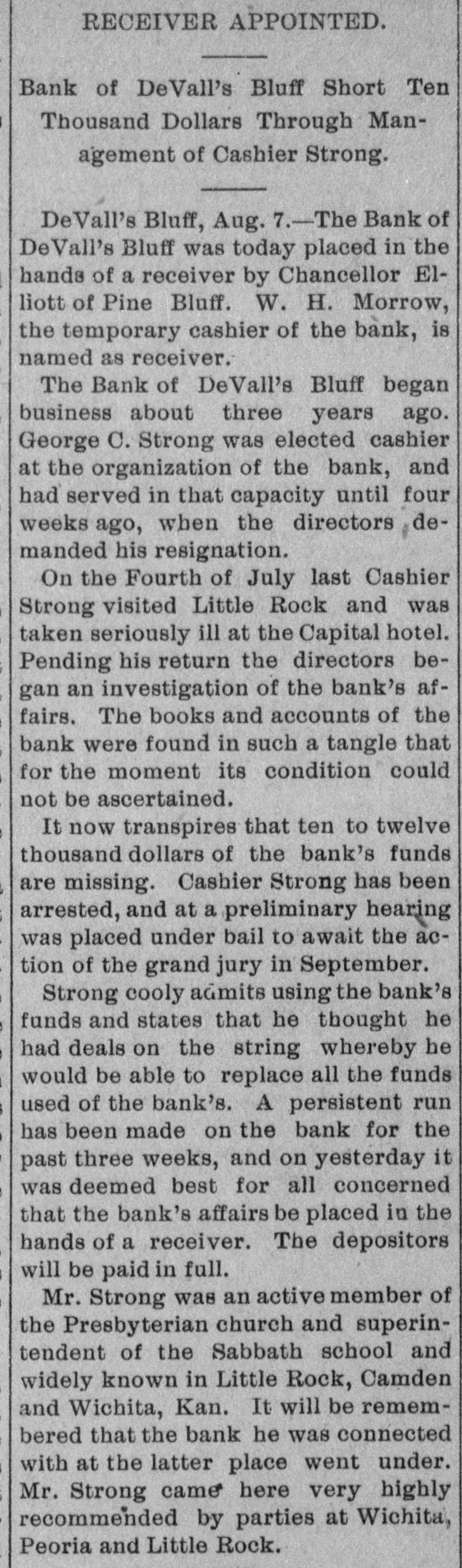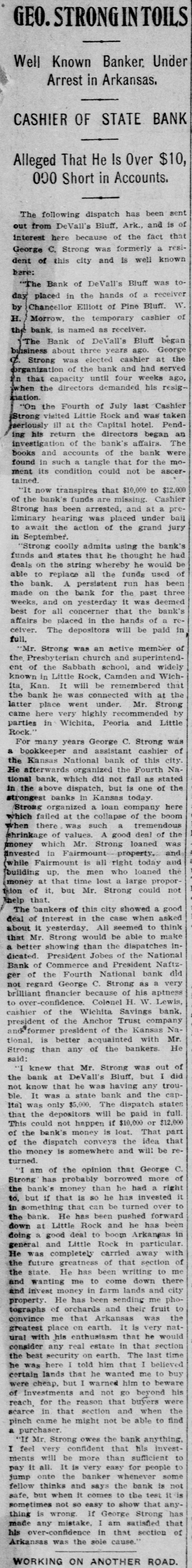 GEO. STRONG IN TOILS Well Known Banker. Under Arrest in Arkansas. CASHIER OF STATE BANK Alleged That He Is Over $10, 000 Short in Accounts. The following dispatch has been sent out from DeVall's Bluff, Ark., and is of interest here because of the fact that George C. Strong was formerly a resident of this city and is well known here: "The Bank of DeVall's Bluff was today placed in the hands of a receiver by Chancellor Elliott of Pine Bluff. W. H. Morrow, the temporary cashier of the bank, is named as receiver. "The Bank of DeVall's Bluff began bisiness about three years ago. George c. Strong was elected cashier at the organization of the bank and had served in that capacity until four weeks ago, when the directors demanded his resignation. "On the Fourth of July last Cashier Strong visited Little Rock and was taken seriously ill at the Capital hotel. Pending his return the directors began an investigation of the bank's affairs. The books and accounts of the bank were found in such a tangle that for the moment its condition could not be ascertained. "It now transpires that $10,000 to $12,000 of the bank's funds are missing. Cashier Strong has been arrested, and at a preEminary hearing was placed under bail to await the action of the grand jury in September. "Strong coolly admits using the bank's funds and states that he thought he had deals on the string whereby he would be able to replace all the funds used of the bank. A persistent run has been made on the bank for the past three weeks, and on yesterday it was deemed best for all concerner that the bank's affairs be placed in the hands of a receiver. The depositors will be paid in full. "Mr. Strong was an active member of the Presbyterian church and superintendent of the Sabbath school, and widely known in Little Rock, Camden and Wichita, Kan. It will be remembered that the bank he was connected with at the latter place went under. Mr. Strong came here very highly recommended by parties in Wichita, Peoria and Little Rock. For many years George C. Strong was a bookkeeper and assistant cashier of the Kansas National bank of this city. He afterwards organized the Fourth National bank, which did not fail as stated in the above dispatch, but is one of the strongest banks in Kansas today. Strong organized a loan company here which failed at the collapse of the boom when there was such a tremendous shrinkage of values. A good deal of the money which Mr. Strong loaned was Invested in Fairmount property. and (while Fairmount is all right today and building up, the men who loaned the money at that time lost a large proportion of it, but Mr. Strong could not help that. The bankers of this city showed a good deal of interest in the case when asked about it yesterday. All seemed to think that Mr. Strong would be able to make a better showing than the dispatches indicated. President Jobes of the National Bank of Commerce and President Naftzger of the Fourth National bank did not regard George C. Strong as a very brilliant financier because of his aptness to over-confidence. Colonel H. W. Lewis, cashier of the Wichita Savings bank, president of the Anchor Trust company and former president of the Kansas National, is better acquainted with Mr. Strong than any of the bankers. He said: "I knew that Mr. Strong was out of the bank at DeVall's Bluff, but I did not know that he was having any trouble. It was a state bank and the capItal was only $5,000. The dispatch states that the depositors will be paid in full This could not happen if $10,000 or $12,000 of the bank's money is lost. That part of the dispatch conveys the idea that the money is somewhere and will be returned. "I am of the opinion that George C. Strong has probably borrowed more of the bank's money than he had a right to, but if that is so he has invested it in something that can be turned over to the bank. He has been pushed forward down at Little Rock and he has been doing a good deal to boom Arkansas in general and Little Rock in particular. He was completely carried away with the future greatness of that section of the state. He has been writing to me and wanting me to come down there and invest money in farm lands and city property He has been sending me photographs of orchards and their fruit to convince me that Arkansas was the greatest place on earth. It is very natural with his enthusiasm that he would consider any real estate in that section the best security on earth. The last time he was here I told him that I believed certain lands that he wanted me to buy were cheap, but I warned him to beware of Investments and not go beyond his reach, for the reason that buyers were scarce in that section and when the pinch came he might not be able to find a purchaser. "If Mr. Strong owes the bank anything, I feel very confident that his investments will be more than sufficient to pay it all. It is very easy for people to jump onto the banker whenever some fellow thinks and says the bank is not safe, but when It comes to the test it is sometimes not 80 easy to show that anything is wrong. If George Strong has made any mistake, I am satisfied that his over-confidence in that section of Arkansas was the sole cause.' WORKING ON ANOTHER ROAD.