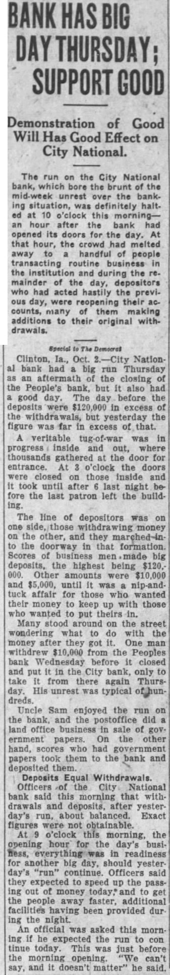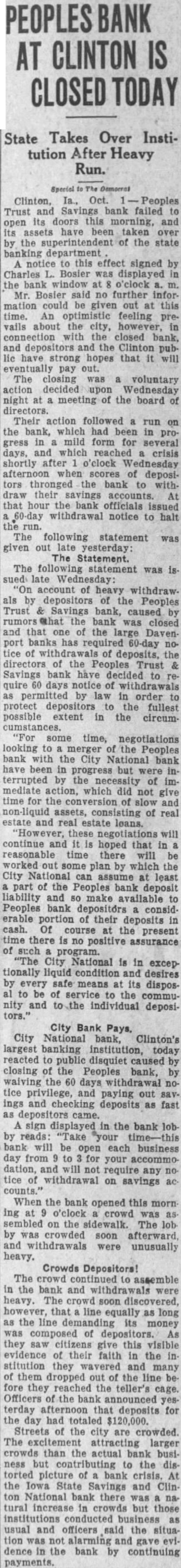 AT CLINTON IS State Takes Over Institution Heavy Run. Clinton, Oct. Trust and Savings bank failed to open its doors this morning, and its assets have been taken over the the state banking department notice this effect signed Charles Bosier was displayed the bank window o'clock Mr. Bosier said no further inforcould be given out at this time. An optimistic feeling vails about the city, however, in connection with the closed bank, and depositors and the Clinton public have strong hopes that It eventually pay out. The closing was voluntary action decided upon Wednesday night at meeting of the board directors. Their action followed the bank, which had been in progress in mild form for several days, and which reached crisis shortly after o'clock afternoon when scores of depositors the bank to draw their At that hour the bank officials issued withdrawal notice to halt the The following statement given out late yesterday: The Statement. The following statement was sued late account of heavy withdraw. als by depositors of the Peoples Trust Savings bank, caused by rumors the bank was closed and that one of the large Daven port banks has required notice of withdrawals of deposits, the directors of the Peoples Trust Savings bank have decided quire days notice of withdrawals permitted by law in order protect depositors to the fullest possible extent in the circumcumstances. "For some time, negotiations looking to merger of the Peoples bank with the City National bank have been in progress but interrupted by the necessity of immediate action, which did not time for the of slow and non-liquid assets, consisting of real estate and real estate loans. these will continue and hoped that reasonable time there will be worked out some plan by which the City National can assume at least part of the Peoples bank deposit liability and make available to Peoples bank depositors considerable portion of their deposits in cash. Of course at the present time there is no positive assurance of such program. City National exceptionally liquid condition and desires every safe means its disposto of service the community and individual depositors." City Bank City National bank, Clinton's largest banking institution, today reacted to public disquiet caused closing of the Peoples bank, waiving the 60 days withdrawal notice privilege, and paying out ings and checking deposits as fast depositors came. A sign displayed in the bank reads: your bank will be open each business day from to your accommodation, and not require any no tice of withdrawal on savings counts." When the bank opened this morn ing at o'clock crowd was sembled on the sidewalk. The was crowded soon afterward, and withdrawals were unusually heavy. Crowds Depositors! The crowd continued to assemble the bank and withdrawals heavy. The crowd soon discovered, however, that line equally as long the line demanding money composed of depositors. As they saw citizens give this visible evidence of their faith in the in stitution they wavered and many of them dropped out of the line fore they reached the teller's cage. Officers of the bank yes terday that deposits for the day had totaled $120,000. Streets of the city are crowded. The attracting larger crowds than the actual bank business contributing to the distorted picture of bank crisis, At the Iowa State Savings and ClinNational bank there was natural increase crowds but institutions business as usual and officers said the situation was not alarming and evidence in the bank by continuing payments.