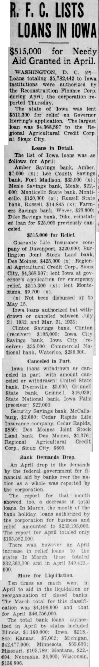 R. F. c. LISTS LOANS IN IOWA $515,000 for Needy Aid Granted in April. WASHINGTON D. C. (AP)Loans totaling $5,782,442 to Iowa institutions were authorized by the Reconstruction Finance Corp. during April, the corporation reported Thursday. The state of Iowa was lent $515,300 for relief on Governor Herring's application. The largest loan was $4,368,597 to the Regional Agricultural Credit Corp. at Loans in Detail. The list of Iowa loans was as follows for April: Amber Savings bank, Amber. $7,000 (x): Lee County Savings bank, Fort Madison, $35,000 (x) Menlo Savings bank, Menlo, $22.000: Monticello State bank. Monticello, $120,000 (x): Russell State bank. Russell, $14,845 (x) Farm ers Savings bank. Wever, $20,000 Dike Savings bank, Dike. reinstated loan for $25,000 previously canceled. $515,000 for Relief. Guaranty Life Insurance company of Davenport, $220,000; Burlington Joint Stock Land bank Des Moines, $425,000 (x): Regional Agricultural Credit Corp., Sioux City, $4,368,597: lent Iowa at gov. ernor's application for emergency relief. $515,300 (x): lent Monte$9 700 (x). (x) Not been disbursed up to May 15. Iowa loans authorized but withdrawn or canceled between July 21. 1932. and Mar 31. 1933 Clinton Savings bank, Clinton (receiver) $105,000 Iowa City Savings bank, Iowa City (receiver) $35,000: Commercial National bank, Waterloo, $280,000. Canceled in Part. Iowa loans withdrawn or canceled in part, with amount canceled withdrawn: United State bank. Dyersville, $5,000 Grinnell State National bank, Iowa Falls (receiver) $22,000. Security Savings bank. McCallsburg, $2,600: Cedar Rapids Life Insurance company, Cedar Rapids, $850; Des Moines Joint Stock Land bank, Des Moines, $1,376; Regional Agricultural Credit Corp., Sioux City, $600. Bank Demands Drop. An April drop in the demands by the federal government for financial aid by banks over the nation a whole was reported by the corporation. The report for that month showed. too. decrease in total loans. In March the month of the bank holiday, loans authorized by the corporation for business and relief amounted to $233,195,000 The report for April totaled only $195,582,000 There was however, an April increase in relief loans to the states In March these totaled $32,360,000 and in April $49,423, 000. More for Liquidation. Ten times as much went in April to aid in the liquidation or reorganization of closed banks The March total for this classification was $4,196,000 and that for April $46,756,000 The total bank loans authorized in April by states included 845; Kansas, $7,002: Michigan $136,806.