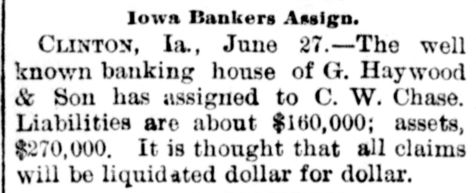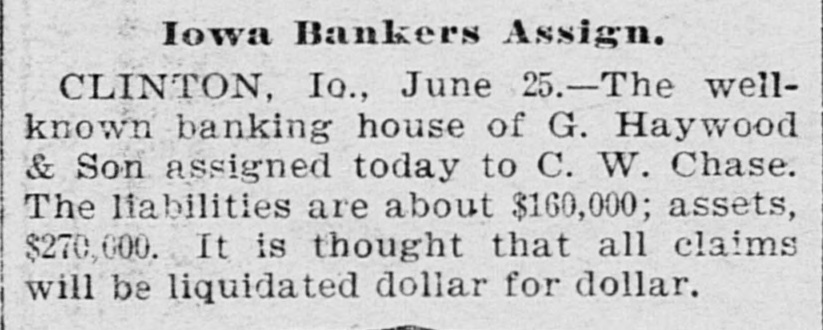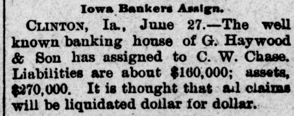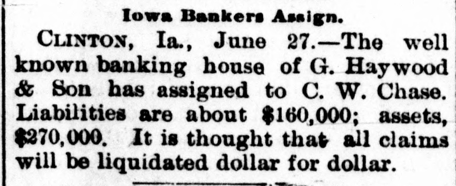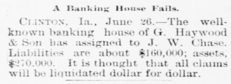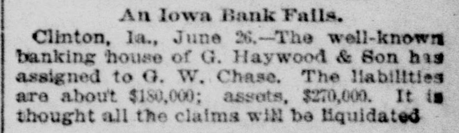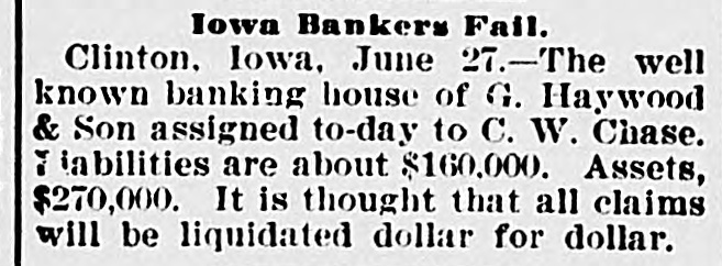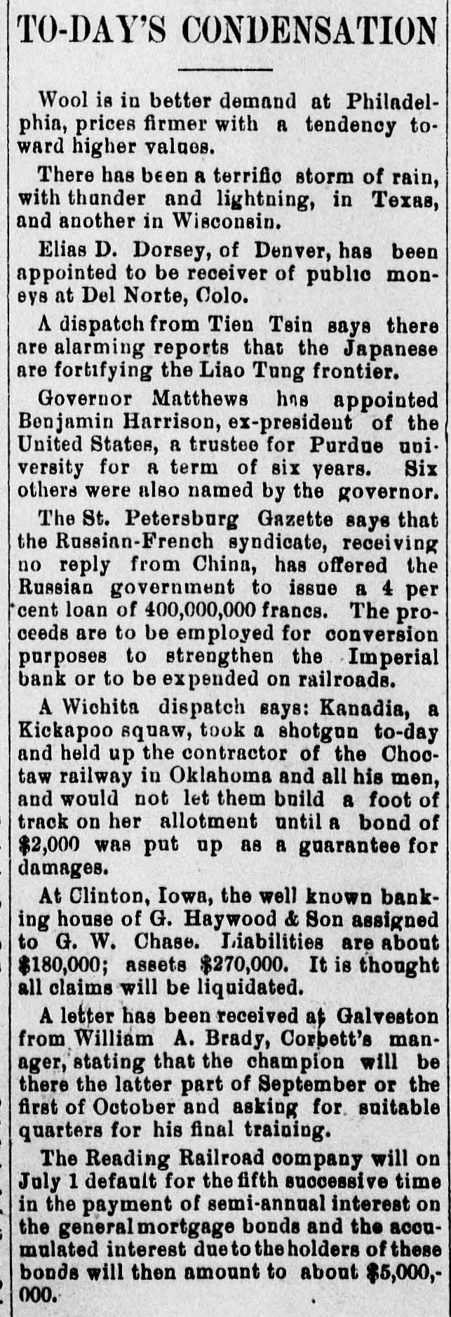 TO-DAY'S CONDENSATION Wool is in better demand at Philadelphia, prices firmer with a tendency toward higher values. There has been a terrific storm of rain, with thunder and lightning, in Texas, and another in Wisconsin. Elias D. Dorsey, of Denver, has been appointed to be receiver of public moneys at Del Norte, Colo. A dispatch from Tien Tsin says there are alarming reports that the Japanese are fortifying the Liao Tung frontier. Governor Matthews has appointed Benjamin Harrison, ex-president of the United States, a trustee for Purdue uni. versity for a term of six years. Six others were also named by the governor. The St. Petersburg Gazette saye that the Russian-French syndicate, receiving no reply from China, has offered the Russian government to issue a 4 per cent loan of 400,000,000 francs. The proceeds are to be employed for conversion purposes to strengthen the Imperial bank or to be expended on railroads. A Wichita dispatch says: Kanadia, a Kickapoo squaw, took a shotgun to-day and held up the contractor of the Choctaw railway in Oklahoma and all his men, and would not let them build a foot of track on her allotment until a bond of $2,000 was put up as a guarantee for damages. At Clinton, Iowa, the well known banking house of G. Haywood & Son assigned to G. W. Chase. Liabilities are about $180,000; assets $270,000. It is thought all claims will be liquidated. A letter has been received at Galveston from William A. Brady, Corbett's manager, stating that the champion will be there the latter part of September or the first of October and asking for. suitable quarters for his final training. The Reading Railroad company will on July 1 default for the fifth successive time in the payment of semi-annual interest on the general mortgage bonds and the accumulated interest dueto the holders of these bonds will then amount to about $5,000,000.