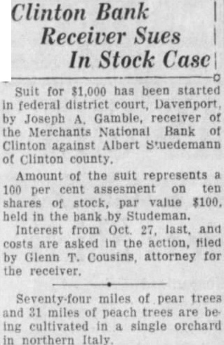 Clinton Bank Receiver Sues In Stock Case Suit for $1,000 has been started in federal district court, Davenport by Joseph A. Gamble, receiver of the Merchants National Bank of Clinton against Albert Stuedemann of Clinton county. Amount of the suit represents a 100 per cent assesment on ten shares of stock, par value $100. held in the bank by Studeman. Interest from Oct. 27, last, and costs are asked in the action, filed by Glenn T. Cousins, attorney for the receiver. Seventy-four miles of pear trees and 31 miles of peach trees are be ing cultivated in a single orchard in northern Italy