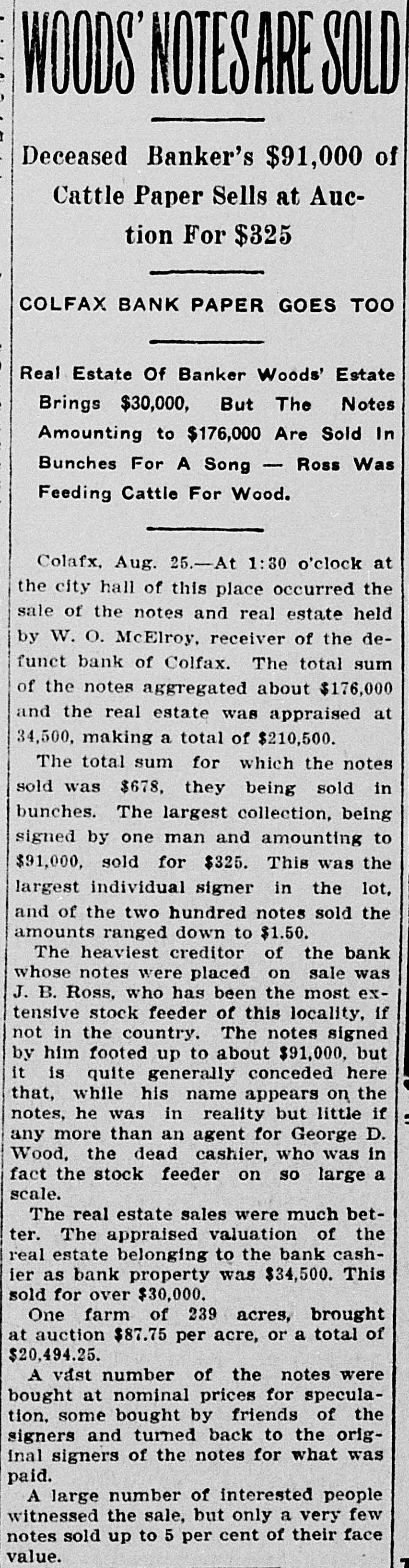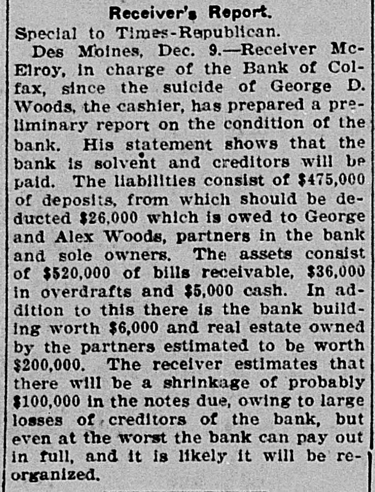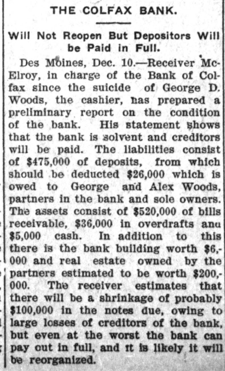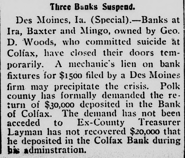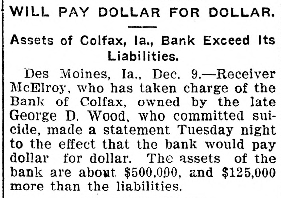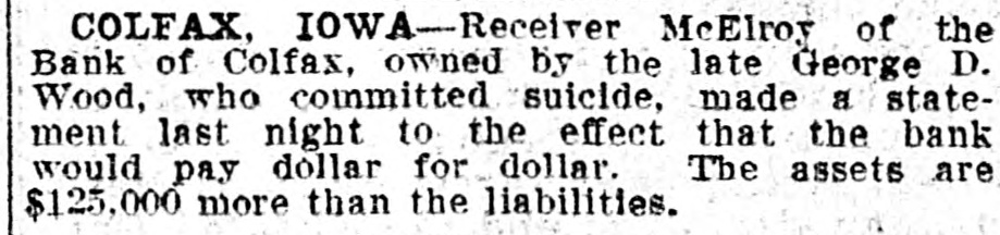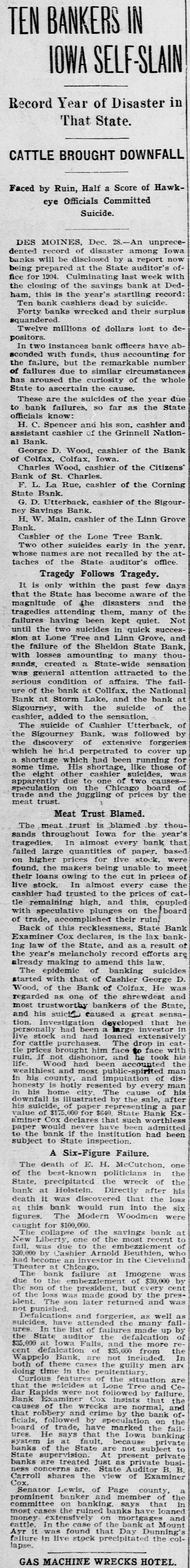 TEN BANKERS IN IOWA SELF-SLAIN Record Year of Disaster in That State. CATTLE BROUGHT DOWNFALL Faced by Ruin, Half a Score of Hawkeye Officials Committed Suicide. DES MOINES, Dec. 28.-An unprecedented record of disaster among Iowa banks will be disclosed by a report now being prepared at the State auditor's office for 1904. Culminating last week with the closing of the savings bank at Dedham, this is the year's startling record: Ten bank cashiers dead by suicide. Forty banks wrecked and their surplus squandered. Twelve millions of dollars lost to depositors. In two instances bank officers have absconded with funds, thus accounting for the failure, but the remarkable number of failures due to similar circumstances has aroused the curiosity of the whole State to ascertain the cause. These are the suicides of the year due to bank failures, so far as the State officials know: H. C. Spencer and his son, cashier and assistant cashier of the Grinnell National Bank. George D. Wood, cashier of the Bank of Colfax, Colfax, Iowa. Charles Wood, cashier of the Citizens' Bank of St. Charles. F. L. La Rue, cashier of the Corning State Bank. G. D. Utterback, cashier of the Sigourney Savings Bank. H. W. Main, cashier of the Linn Grove Bank. Cashier of the Lone Tree Bank. Two other suicides early in the year, whose names are not recalled by the attaches of the State auditor's office. Tragedy Follows Tragedy. It is only within the past few days that the State has become aware of the magnitude of the disasters and the tragedies attending them, many of the failures having been kept quiet. Not until the two suicides in quick succession at Lone Tree and Linn Grove, and the failure of the Sheldon State Bank, with losses amounting to many thousands, created a State-wide sensation was general attention attracted to the serious condition of affairs. The failure of the bank at Collfax, the National Bank at Storm Lake, and the bank at Sigourney, with the suicide of the cashier, added to the sensation. The suicide of Cashier Utterback, of the Sigourney Bank, was followed by the discovery of extensive forgeries which he had perpetrated to cover up a shortage which had been running for some time. His shortage, like those of the eight other cashier suicides, was apparently due to one of two causesspeculation on the Chicago board of trade and the juggling of prices by the meat trust. Meat Trust Blamed. The meat trust is blamed by thousands throughout Iowa for the year's tragedies. In almost every bank that failed large quantities of paper, based on higher prices for five stock, were found, the makers being unable to meet their loans owing to the cut in prices of live stock. In almost every case the cashier had trusted to the prices of cattle remaining high, and this, coupled with speculative plunges on the board of trade, accomplished their ruin. Back of this recklessness. State Bank Examiner Cox declares, is the lax banking law of the State, and as a result of the year's melancholy record efforts are already making to amend this law. The epidemic of banking suicides started with that of Cashier George D. Wood, of the Bank of Colfax He was regarded as one of the shrewdest and most trustworthy bankers of the State, and his suicks caused a great sensation. Investigation developed that he personally had been a large investor in live stock and had loaned extensively for cattle purchases. The drop in eattle prices brought him face to face with ruin, if not dishonor, and he took his life. Wood had been accounted the wealthiest and most public-spirited man in his county, and imputation of dishonesty is hotly resented by every man in his home city. The cause of his downfall is illustrated by the sale, after his suicide, of paper representing a par value of $175,000 for $640. State Bank Examiner Cox declares that such worthless paper would never have been admitted to the bank if the institution had been subject to State inspection. A Six-Figure Failure. The death of E. H. McCutchon, one of the best-known politicians in the State, precipitated the wreck of the bank at Holstein. Directly after his death it was discovered that the loss at this bank would run into the six