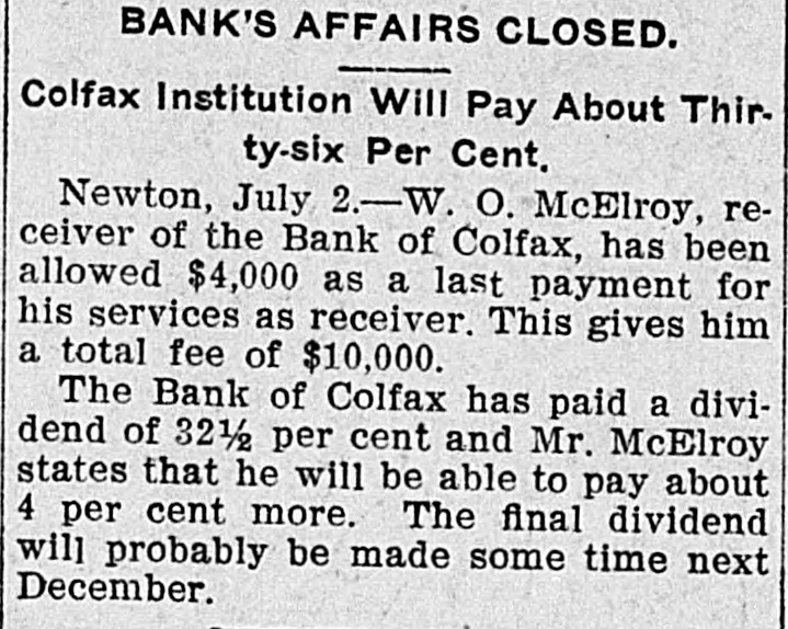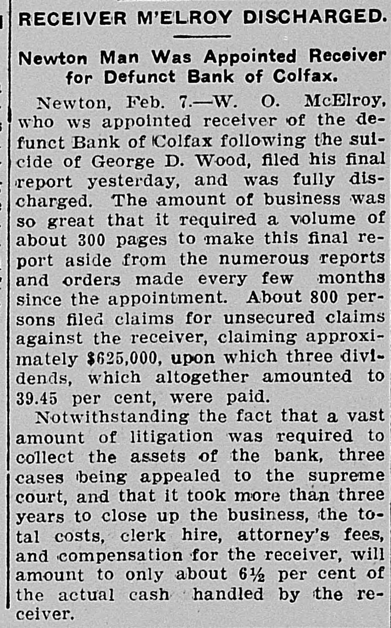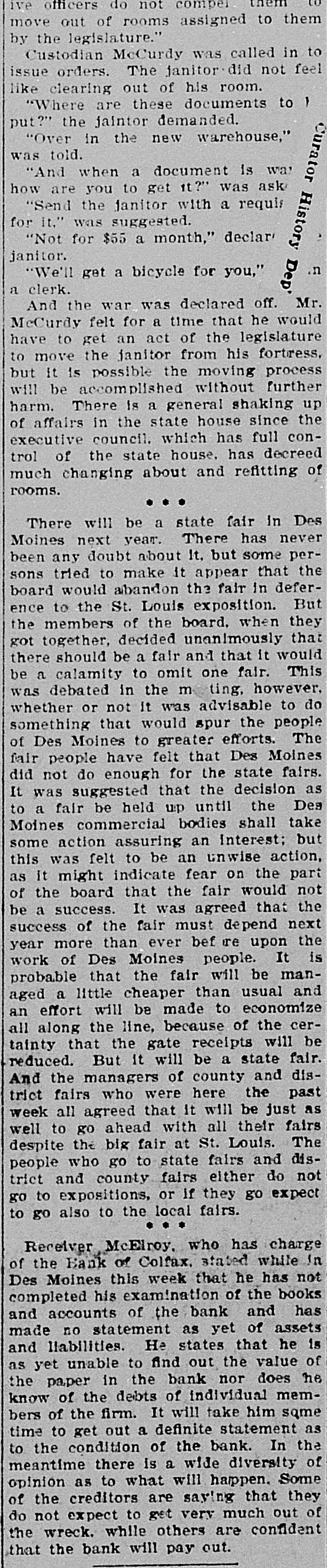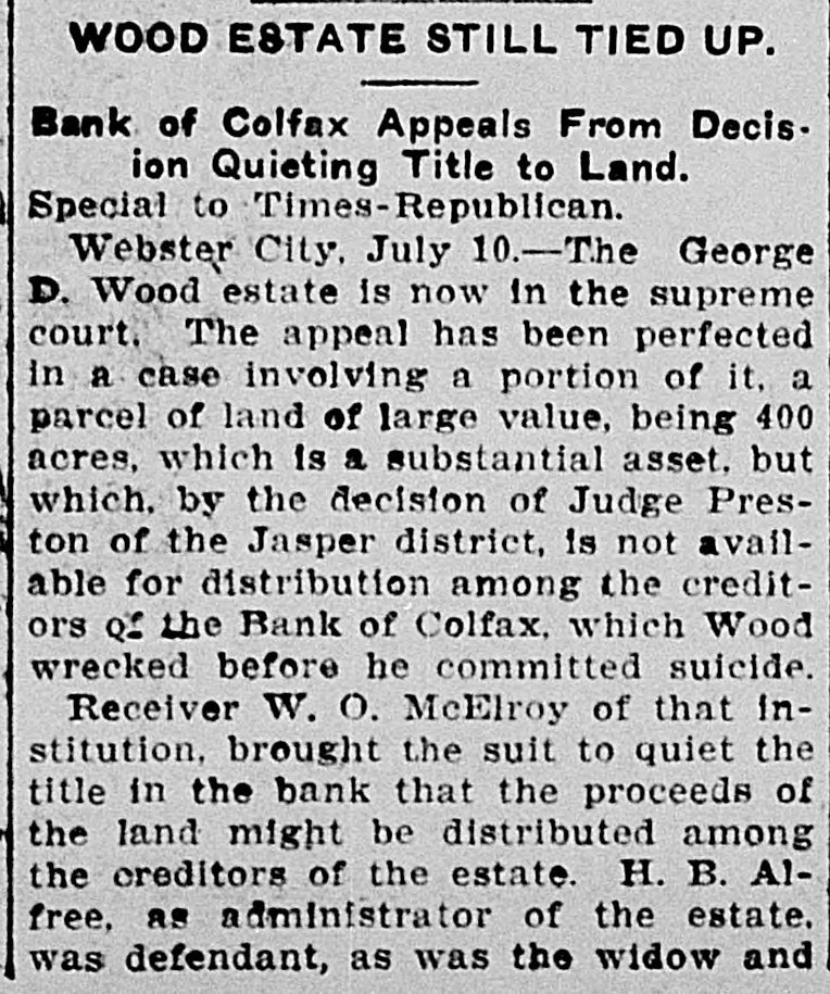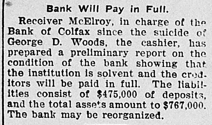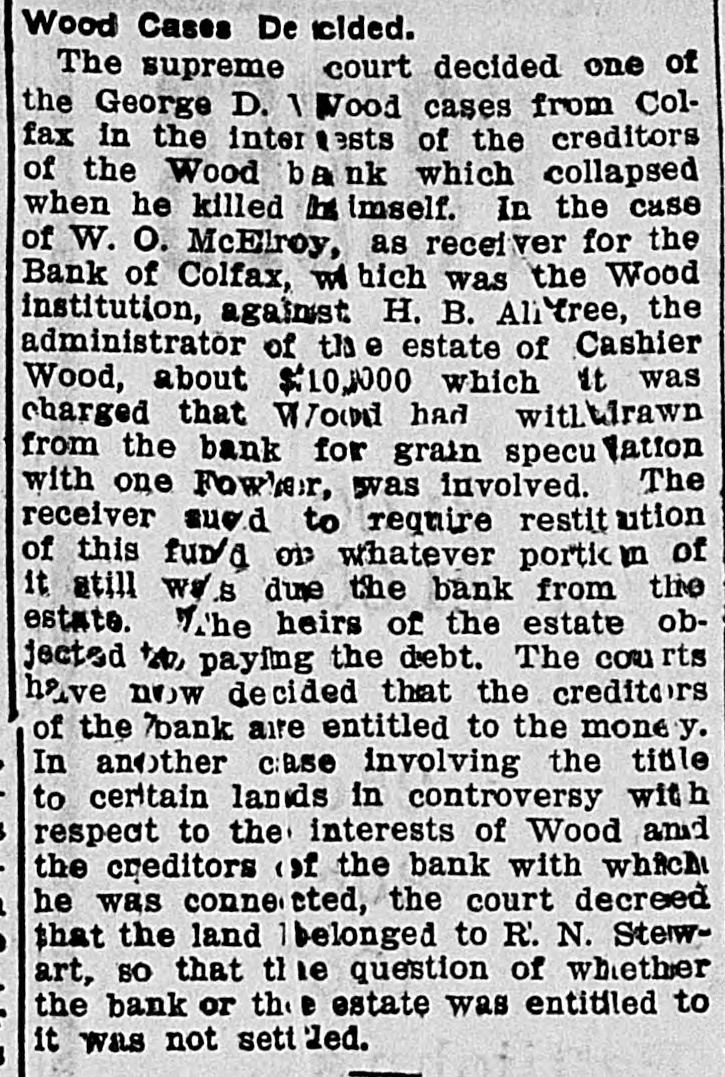 TEN BANKERS IN IOWA SELF-SLAIN Record Year of Disaster in That State. CATTLE BROUGHT DOWNFALL Faced by Ruin, Half a Score of Hawkeye Officials Committed Suicide. DES MOINES, Dec. 28.-An unprecedented record of disaster among Iowa banks will be disclosed by a report now being prepared at the State auditor's office for 1904. Culminating last week with the closing of the savings bank at Dedham, this is the year's startling record: Ten bank cashiers dead by suicide. Forty banks wrecked and their surplus squandered. Twelve millions of dollars lost to depositors. In two instances bank officers have absconded with funds, thus accounting for the failure, but the remarkable number of failures due to similar circumstances has aroused the curiosity of the whole State to ascertain the cause. These are the suicides of the year due to bank failures, so far as the State officials know: H. C. Spencer and his son, cashier and assistant cashier of the Grinnell National Bank. George D. Wood, cashier of the Bank of Colfax, Colfax, Iowa. Charles Wood, cashier of the Citizens' Bank of St. Charles. F. L. La Rue, cashier of the Corning State Bank. G. D. Utterback, cashier of the Sigourney Savings Bank. H. W. Main, cashier of the Linn Grove Bank. Cashier of the Lone Tree Bank. Two other suicides early in the year, whose names are not recalled by the attaches of the State auditor's office. Tragedy Follows Tragedy. It is only within the past few days that the State has become aware of the magnitude of the disasters and the tragedies attending them, many of the failures having been kept quiet. Not until the two suicides in quick succession at Lone Tree and Linn Grove, and the failure of the Sheldon State Bank, with losses amounting to many thousands, created a State-wide sensation was general attention attracted to the serious condition of affairs. The failure of the bank at Collfax, the National Bank at Storm Lake, and the bank at Sigourney, with the suicide of the cashier, added to the sensation. The suicide of Cashier Utterback, of the Sigourney Bank, was followed by the discovery of extensive forgeries which he had perpetrated to cover up a shortage which had been running for some time. His shortage, like those of the eight other cashier suicides, was apparently due to one of two causesspeculation on the Chicago board of trade and the juggling of prices by the meat trust. Meat Trust Blamed. The meat trust is blamed by thousands throughout Iowa for the year's tragedies. In almost every bank that failed large quantities of paper, based on higher prices for five stock, were found, the makers being unable to meet their loans owing to the cut in prices of live stock. In almost every case the cashier had trusted to the prices of cattle remaining high, and this, coupled with speculative plunges on the board of trade, accomplished their ruin. Back of this recklessness. State Bank Examiner Cox declares, is the lax banking law of the State, and as a result of the year's melancholy record efforts are already making to amend this law. The epidemic of banking suicides started with that of Cashier George D. Wood, of the Bank of Colfax He was regarded as one of the shrewdest and most trustworthy bankers of the State, and his suicks caused a great sensation. Investigation developed that he personally had been a large investor in live stock and had loaned extensively for cattle purchases. The drop in eattle prices brought him face to face with ruin, if not dishonor, and he took his life. Wood had been accounted the wealthiest and most public-spirited man in his county, and imputation of dishonesty is hotly resented by every man in his home city. The cause of his downfall is illustrated by the sale, after his suicide, of paper representing a par value of $175,000 for $640. State Bank Examiner Cox declares that such worthless paper would never have been admitted to the bank if the institution had been subject to State inspection. A Six-Figure Failure. The death of E. H. McCutchon, one of the best-known politicians in the State, precipitated the wreck of the bank at Holstein. Directly after his death it was discovered that the loss at this bank would run into the six