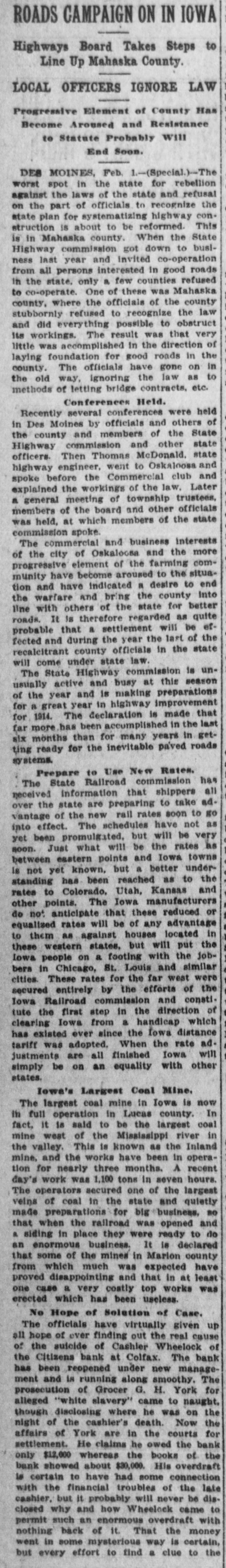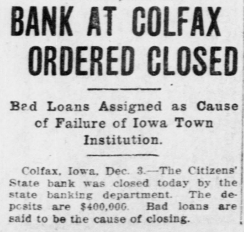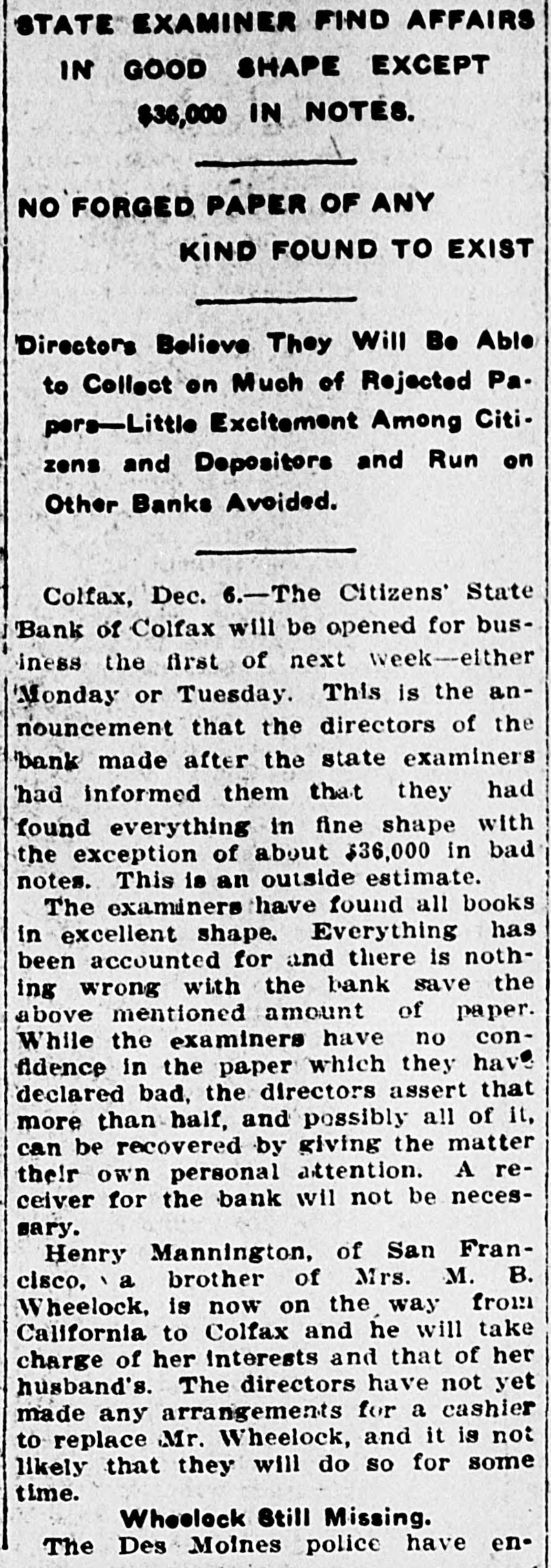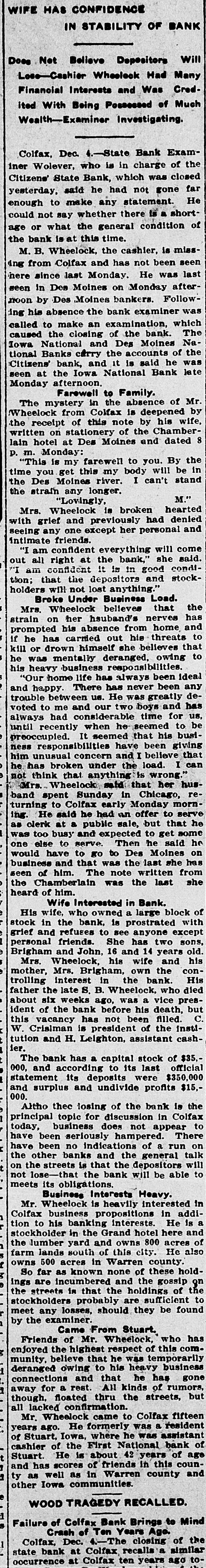 WIFE HAS CONFIDENCE IN STABILITY OF BANK Does Net Believe Depositors Will Lose Cashier Wheeleck Had Many Financial Interests and Was Credited With Being Possessed of Much Wealth-Examiner Investigating. Colfax, Dec. 4.-State Bank Examiner Wolever, who is in charge of the Citizens' State Bank, which was closed yesterday, said he had not gone far enough to make any statement. He could not say whether there is a shortage or what the general condition of the bank is at this time. M. B. Wheelock, the cashier, is missing from Colfax and has not been seen here since last Monday. He was last seen in Des Moines on Monday afternoon by Des Moines bankers. Following his absence the bank examiner was called to make an examination, which caused the closing of the bank. The Iowa National and Des Moines National Banks carry the accounts of the Citizens' bank, and it is said he was seen at the Iowa National Bank late Monday afternoon. Farewell to Family. The mystery in the absence of Mr. Wheelock from Colfax is deepened by the receipt of this note by his wife, written on stationery of the Chamberlain hotel at Des Moines and dated 8 p. m. Monday: "This is my farewell to you. By the time you get this my body will be in the Des Moines river. I can't stand the strain any longer. M." "Lovingly, Mrs. Wheelock is broken hearted with grief and previously had denied seeing any one except her personal and intimate friends. "I am confident everything will come out all right at the bank," she said. "I am confident it is in good condition; that the depositors and stockholders will not lost anything." Broke Under Business Load. Mrs. Wheelock believes that the strain on her hsuband's nerves has prompted his absence from home and if he has carried out his threats to kill or drown himself she believes that he was mentally deranged. owing to his heavy business responsibilities. "Our home life has always been ideal and happy There has never been any trouble between us. He was greatly devoted to me and our two boys and has always had considerable time for us, until recently when he seemed to be preoccupied. It seemed that his business responsibilities have been giving him unusual concern and I believe that he has broken under the load. I can not think that anything is wrong." Mrs. Wheelock said that her husband spent Sunday in Chicago, returning to Colfax early Monday morning. He said he had an offer to serve as clerk at a public sale, but that he was too busy and expected to get some one else to serve. Then he said he would have to go to Des Moines on business and that was the last she has seen of him. The note written from the Chamberlain was the last she heard of him. Wife Interested in Bank. His wife, who owned a large block of stock in the bank, is prostrated with grief and refuses to see anyone except personal friends. She has two sons, Brigham and John, 16 and 14 years old. Mrs. Wheelock, his wife and his mother, Mrs. Brigham, own the controlling interest in the bank. His father the late S. B. Wheelock, who died about six weeks ago, was a vice president of the bank before his death, but this vacancy has not been filled. C. W. Crisiman is president of the institution and H. Leighton, assistant cashier. The bank has a capital stock of $35.000, and according to its last official statement its deposits were $350,000 and surplus and undivide profits $15,000. Altho thec losing of the bank is the principal topic for discussion in Colfax today, business does not appear to have been seriously hampered. There have been no indications of a run on the other banks and the general talk on the streets is that the depositors will not lose-that the bank will be able to meets its obligations. Business Interests Heavy. Mr. Wheelock is heavily interested in Colfax business propositions in addition to his banking interests. He is a stockholder in the Grand hotel here and the lumber yard and owns 800 acres of farm lands south of this city. He also owns 500 acres in Warren county. So far as known none of these holdings are incumbered and the gossip on the streets is that the holdings of the stockholders probably are sufficient to meet any losses, should they be found by the examiner. Came From Stuart. Friends of Mr. Wheelock, who has enjoyed the highest respect of this community, believe that he was temporarily deranged owing to his heavy business connections and that he has gone away for a rest. All kinds of rumors, though, floated thru the streets, but all lacked confirmation. Mr. Wheelock came to Colfax fifteen years ago. He formerly was a resident of Stuart, Iowa, where he was assistant cashier of the First National bank of Stuart. He is about 42 years of age and has scores of friends in this county as well as in Warren county and other Iowa communities. WOOD TRAGEDY RECALLED. Failure of Colfax Bank Brings to Mind