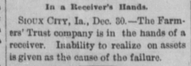 patches. MONTPELIER, VERMONT, January 2.-The Farmers' Trust Company, of Sioux City, Iowa, which closed its doors this week, was an institution in which many people in this vicinity had faith, and the failure will prove a hard blow to its Vermont investors. It is estimated that $100,000 in stock of the company was held in this county. According to returns since the failure, eighty per cent. of the liabilities of $135,000 is said to be due the people of this state. Frank A. Dwinell, the president, George W. Wing, the treasurer, and Clark King, one of the directors, reside here, and the company had an office in this city. Yest's Weekly, Republican, of Staunton, Virginia, has been placed in the hands of a receiver. LIBERTY, IND., Jan. 3.-Henry Husted, cashier of the Union County National Bank of Liberty, Indiana, was found hanging by the neck to a rafter in his stable Saturday. His knees were touching the floor, and he was dead when found by his Husted's financial affairs were believed to be in good condition. He was 67 years old. The past year was a bad one for railroads, since 5,441 miles went into the hands of receivers, involving $178,064,000 of bonds and $102,538,000 of stocks. The B. and O., with 2,094 miles, and the Louisville, New Albany and Chicago, with 501 miles, were the principal sufferers. The present era of receiverships began, says the Railway Age, in 1892, when 10,508 miles of road were involved. In 1893 the milleage was 29,340 miles, in 1894 it was 7,025 miles, in 1895 it was 4,089 miles. To find like figures we have to go back to 1885, when 8,386 miles went into receivers' hands. and 1884, when the mileage was 11,038 miles. In the intermediate years the average was little over 2,000 miles. The five years beginning with 1892 broke the record. Foreclosures in 1896 affected 1,373 miles and $1,150,377,000 of stocks and bonds. Since 1876 the sales under foreclosure have aggregated 89,487 miles, with $5,440,239,000 of stocks and bonds. The Sullivan Savings Institution. of Claremont, N. H., has been placed in the hands of assignees. The Western Paper Bag Company, of Batavia, III., one of the Van Nortwick plants, was placed in the hands of a receiver by the United States Court at Chicago on Saturday. The receiver was required to give a bond of $100,000. A receiver has been appointed for the Little Rock and Mississippi Railroad, a short uncompleted line near Little Rrck, Arkansas. The employes of all the mines in the Massillon, Ohio, district, about 2000 men, have struck on account of a reduction 111 the price of pick mining from 61 to 51 cents per ton. The employes of the Illinois Steel Company have been notified that their wages would be cut on February 1. There are 3500 men employed at the South Chicago mills. M. W. Pyne, dealer in musical instruments, Petersburg, Virginia, made an assignment. The Aberdeen Can Co., of Harford county, Md., has been placed in the hands of a receiver. Attorney General Maloney, of Illinois, has filed an information in court, at Chicago, against the International Building, Loan and Investment Union, declaring it to be insolvent, and for the appointment of a receiver. The Mercantile Trust Company, of New York, filed a bill in St. Louis Thursday for a foreclosure against the St. Louis, Salem and Arkansas Railroad. Quigley & Mullen, wholesale grocers, Wilmington, Delaware, have failed; liabilities $76,000, assets $26,000. Liebler & Maas, printers and lithographers, New York, have assigned. Liabilities, $99, 179; nominal assets, $128,598; actual assets, $34,839. At Liberty, Ind., the Columbia Drill Company has gone into the hands of a receiver. The assets are $17,000. J. H. Johnston & Co (corporation, dealers in diamonds, jewelry and silverware, New York, have assigned. A receiver has been appointed for the Dorner & Dutton Car Wheel Manufacturing Co. Covignat judgments amounting to $68,000 were previously taken against the company. The Bank of Canton, at Canton, Minn., and the Citizen's Bank, of Lanesboro. Minn., both owned and operated by Field, Kelsey & Co., have suspended business. The Commercial Bank of Eau Claire, Wis., capital $30,000, closed Tnursday. Depositors will be paid in full. The Iowa mortgage Company of Hartford, Connecticut, has asked for a receiver. Liabilities $218,129, including $100,000 paid up capital. C. L. Richardson, grocer, and Mrs. H. F. Brown grocer, both of Norfolk, Virginia, have assigned. On Monday three more banks closed their doors in St. Paul, Minnesota. The Merchant's National Bank of Dev. il's Lake, North Dakota, and the First City Bank of Moran Springs, Iowa. M. Schneeberger, Westminster, Md., dry goods, notions, &c. George E. Mather &. Sons, printer's ink manufacturers, New York city have failed.
