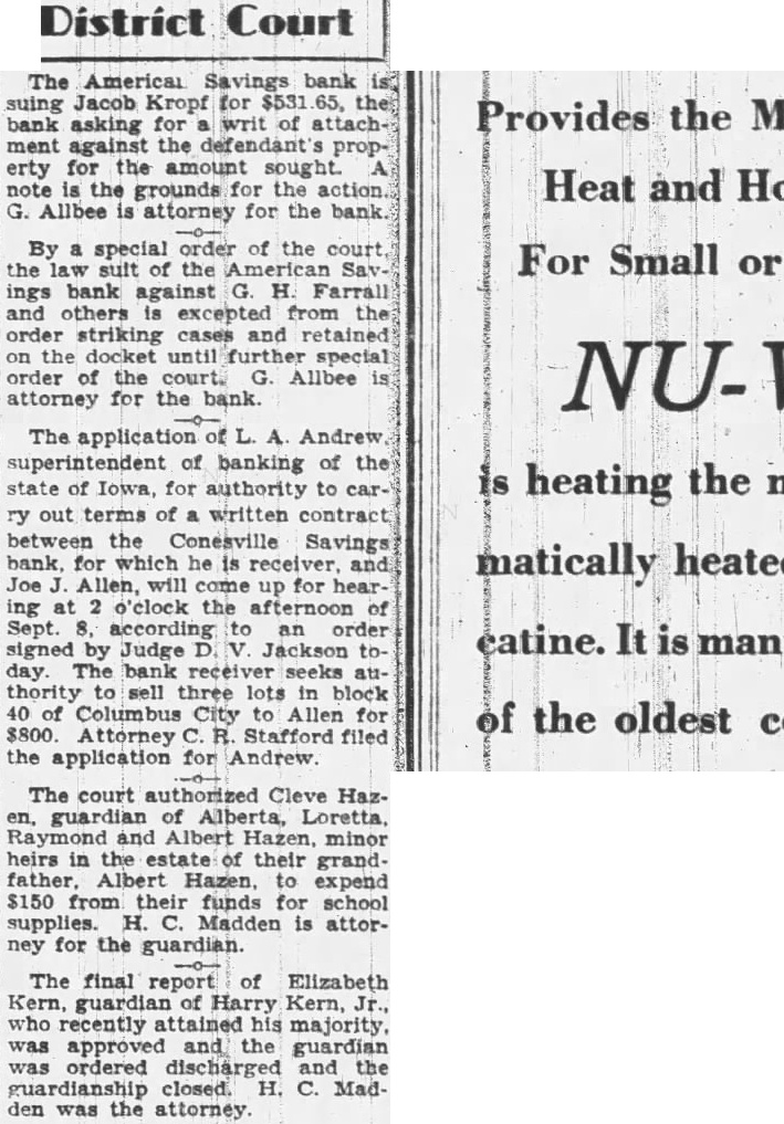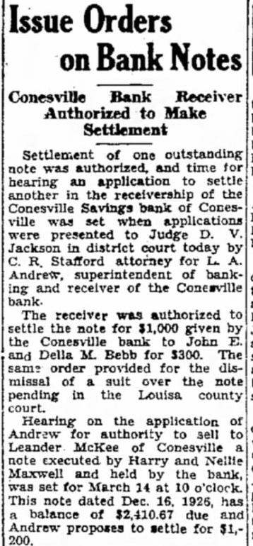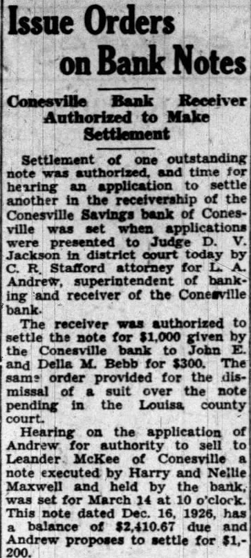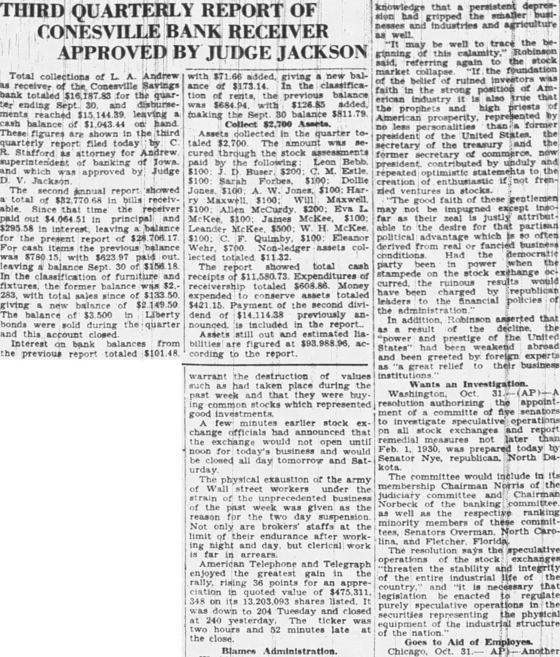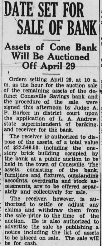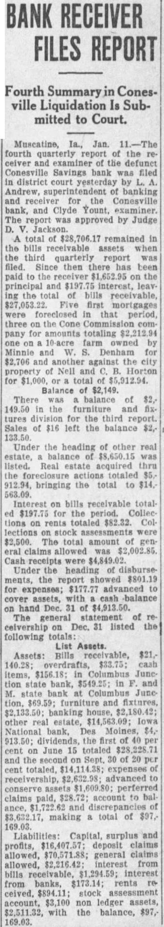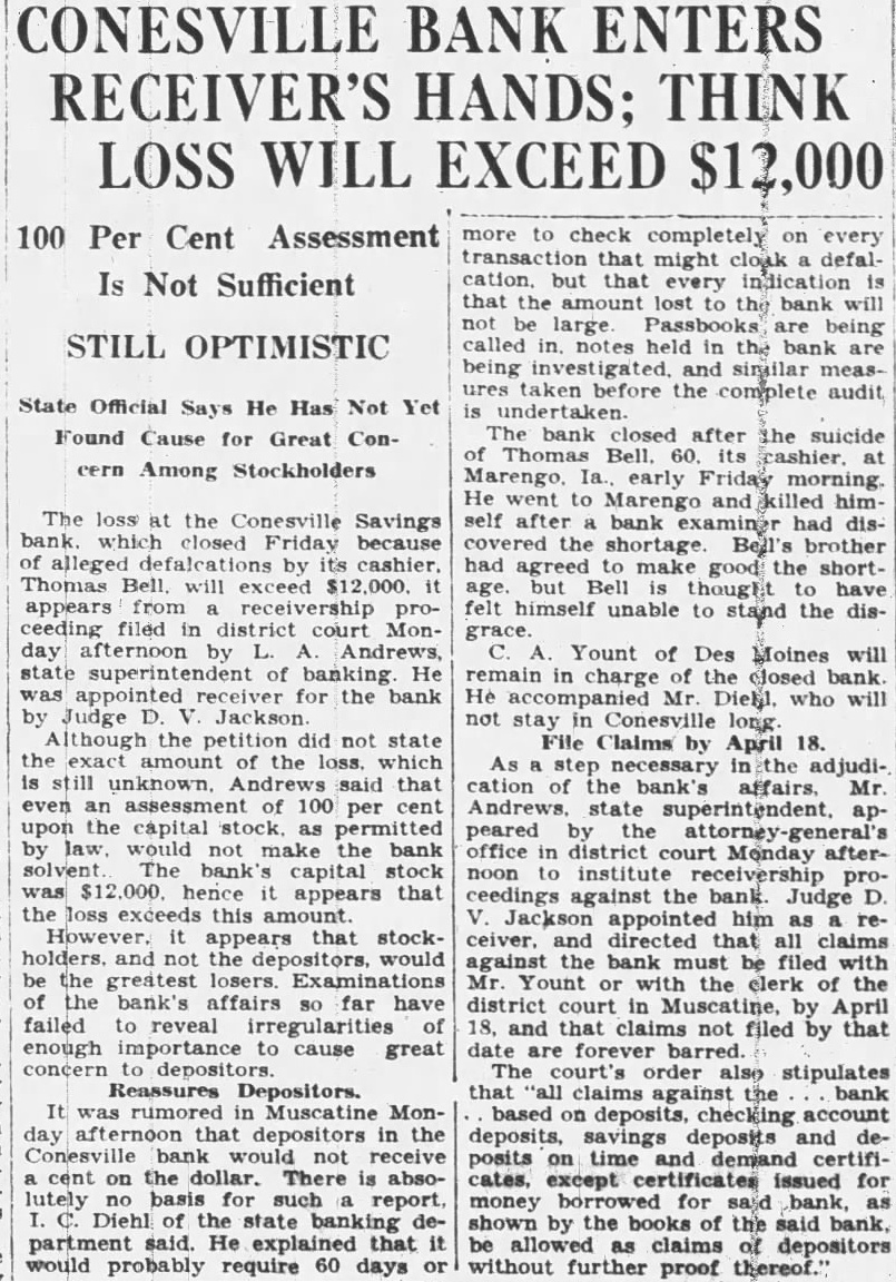 CONESVILLE BANK ENTERS RECEIVER'S HANDS; THINK LOSS WILL EXCEED 100 Per Cent Assessment Is Not Sufficient STILL OPTIMISTIC State Official Says He Has Not Yet Found Cause for Great Concern Among Stockholders The loss at the Conesville Savings bank. which closed Friday because of alleged defalcations by cashier. Thomas will exceed appears from receivership proceeding filed in district court Monday afternoon by Andrews, state superintendent of banking appointed receiver for the bank Judge D. Although the petition did not state the exact amount of the loss. which unknown, said that even an assessment 100 per cent upon the capital stock. as permitted by would not make bank solvent The bank's capital stock hence appears that the loss this However, appears that stockholders. and not the depositors, would be the greatest losers. of the bank's affairs far have failed to reveal of enough to cause great concern depositors. Reassures Depositors. It rumored in Muscatine Monday that depositors in the bank would not receive cent on the dollar. There is absolutely basis for such Diehl of the state partment said. He explained that it would probably require 60 days more to check transaction that might defalcation. but that every indication that the amount lost to bank will not be large Passbooks being called in. notes held in the bank being and similar measures taken before the complete audit The bank closed after the suicide Thomas Bell. early Friday morning. He went to Marengo and killed himself after bank examiner had discovered the shortage. Bell's brother had agreed make good the shortage. but Bell thought have felt himself unable to stand the disgrace. Yount of Des Moines will remain in charge of the closed bank He accompanied who will not stay in Conesville long. File Claims by April 18. As step necessary adjudication of the bank's affairs. Mr. Andrews. state superintendent, appeared by the office district court Monday afternoon to institute receivership proceedings against the bank Judge appointed him and directed that all claims against the bank must be filed with Yount or with the clerk of the district court in by April 18, and that claims not filed by that date are forever barred. The court's order also stipulates that claims against the bank based on deposits, checking account deposits, savings deposits and deposits on time and demand certificates, except certificates issued for money borrowed for said bank, as shown by the books of the said be allowed as claims of depositors without further proof thereof."