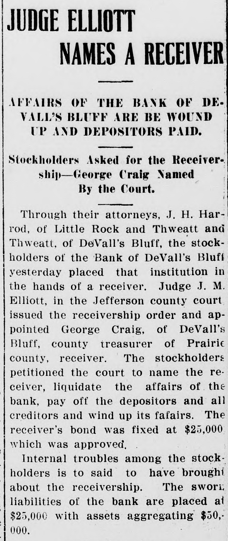 JUDGE ELLIOTT NAMES A RECEIVER AFFAIRS OF THE BANK OF DEVALL'S BLUFF ARE BE WOUND UP AND DEPOSITORS PAID. Stockholders Asked for the Receivership-George Craig Named By the Court. Through their attorneys, J. H. Harrod, of Little Rock and Thweatt and Thweatt, of DeVall's Bluff, the stockholders of the Bank of DeVall's Bluff yesterday placed that institution in the hands of a receiver. Judge J. M. Elliott, in the Jefferson county court issued the receivership order and appointed George Craig, of DeVall's Bluff, county treasurer of Prairie county, receiver. The stockholders petitioned the court to name the receiver, liquidate the affairs of the bank, pay off the depositors and all creditors and wind up its fafairs. The receiver's bond was fixed at $25,000 which was approved. Internal troubles among the stockholders is to said to have broughi about the receivership. The swori. liabilities of the bank are placed at $25,000 with assets aggregating $50,000.