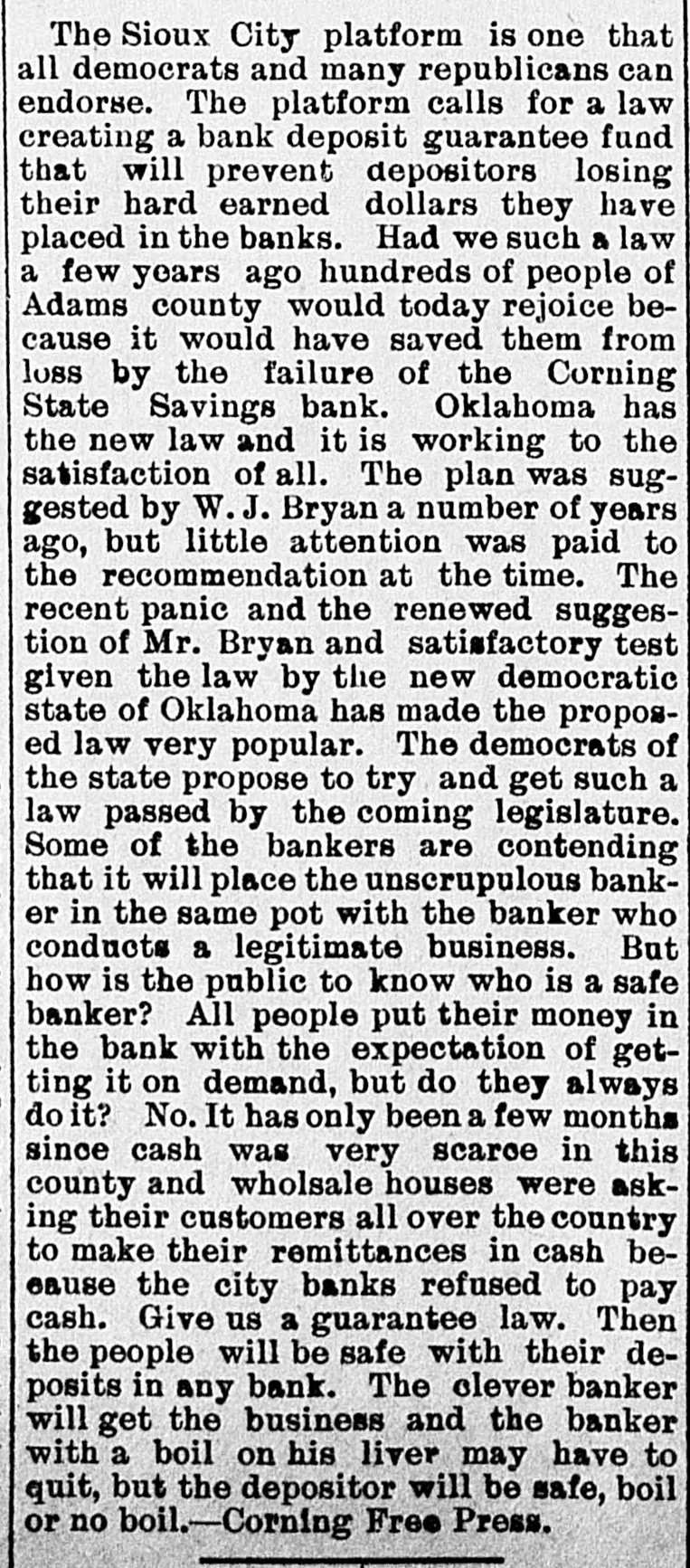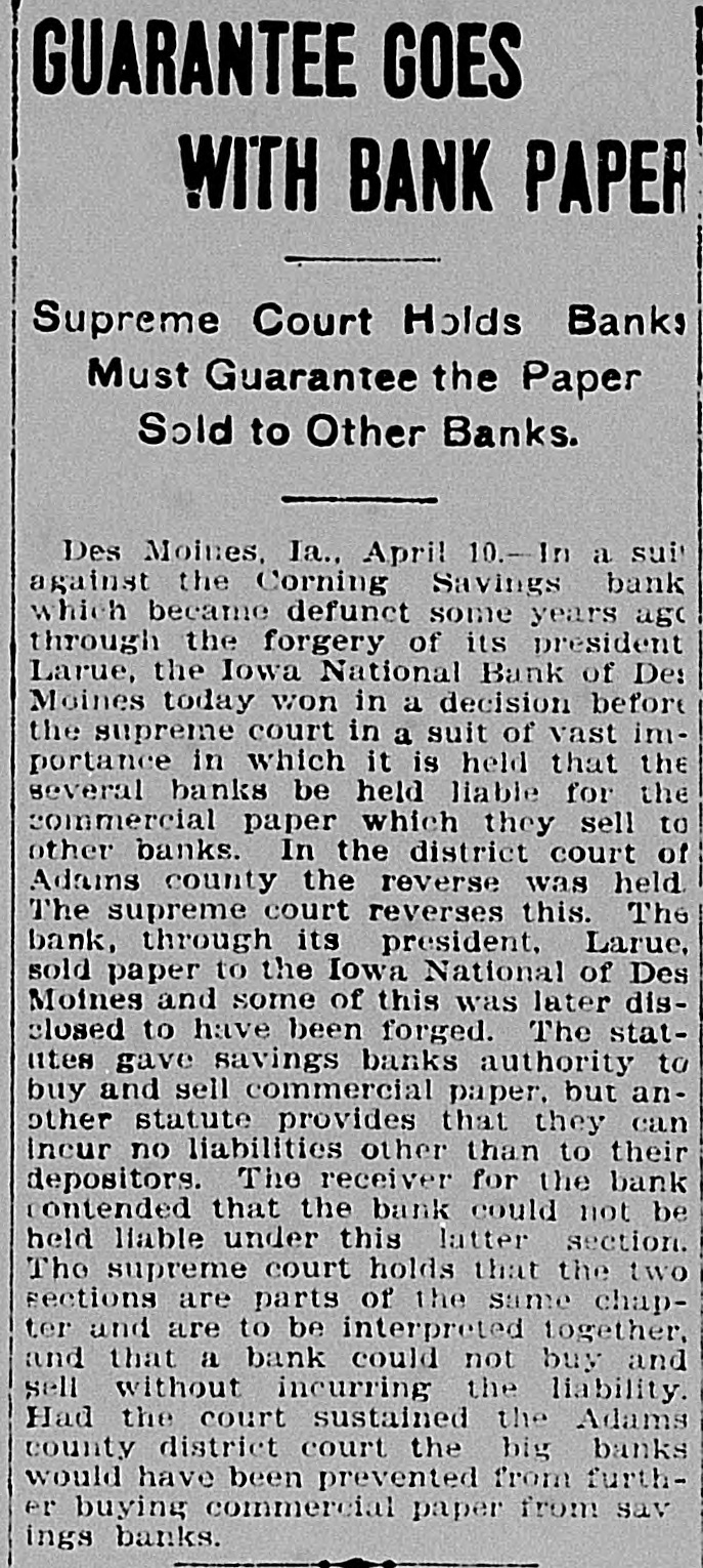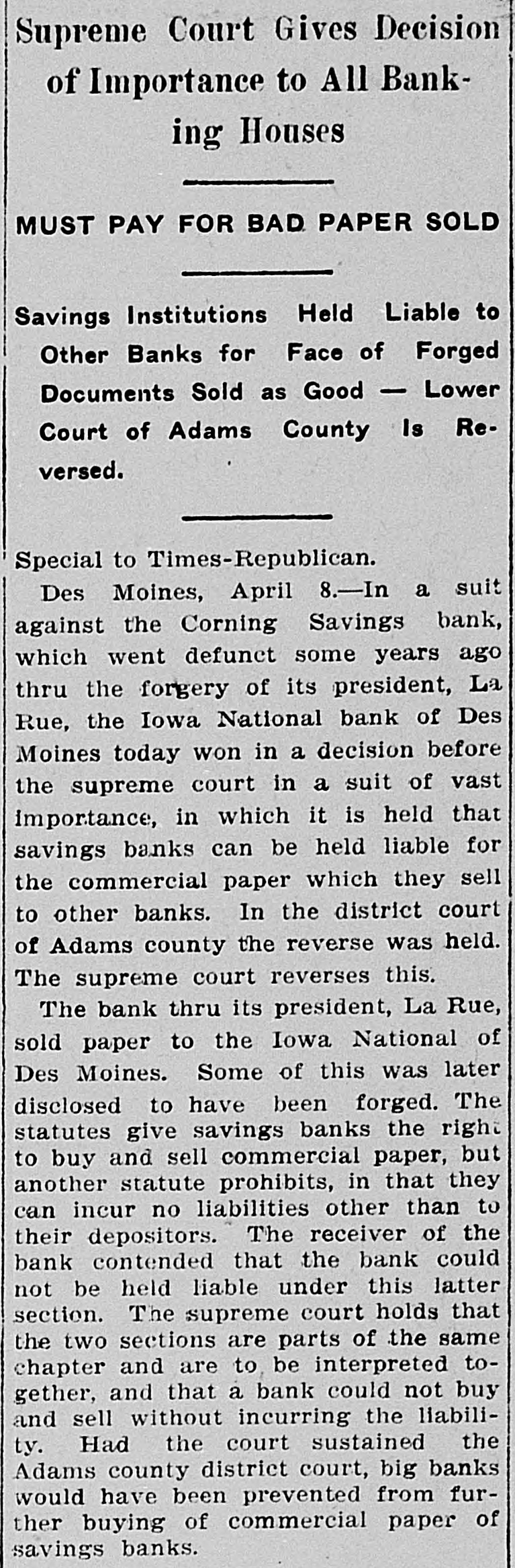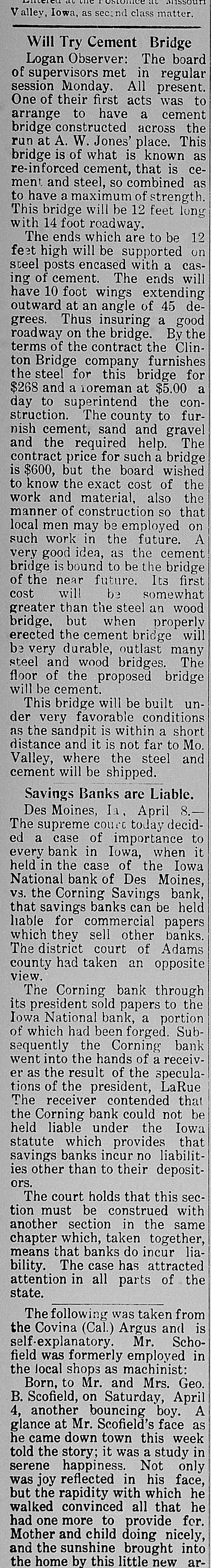 Valley, Iowa, class matter. Will Try Cement Bridge Logan Observer: The board of supervisors met in regular session Monday. All present. One of their first acts was to arrange to have a cement bridge constructed across the run at A. W. Jones' place. This bridge is of what is known as re-inforced cement, that is cemen and steel, so combined as to have a maximum of strength. This bridge will be 12 feet long with 14 foot roadway. The ends which are to be 12 feet high will be supported on posts encased with a casing have of 10 cement. foot wings The extending ends will an dea outward grees. Thus at insuring angle of 45 good roadway on the bridge. By the terms of the contract the Clinton Bridge company furnishes the steel for this bridge for $268 and a roreman at $5.00 to confurday struction. superintend The county the to a nish cement, sand and gravel and the required help. The contract price for such a bridge is $600, but the board wished to know the exact cost of the work and material, also the manner of construction so that local men may be employed on such work in the future. A very good idea, as the cement bridge is bound to be the bridge of the near future. Its first cost will be somewhat greater than the steel an wood bridge, but when properly erected the cement bridge will be very durable, outlast many steel and wood bridges. The floor of the proposed bridge will be cement. This bridge will be built under as a the very sandpit favorable is within conditions short distance and it is not far to Mo. Valley, where the steel and cement will be shipped. Savings Banks are Liable. Des Moines, Ia, April 8.The supreme court today decided a case of importance every bank in Iowa, when it held in the case of the Iowa National bank of Des Moines, vs. the Corning Savings bank, that savings banks can be held liable for commercial papers which they sell other banks. The district court of Adams county had taken an opposite view. The Corning bank through its the Iowa a president National sold bank, papers portion to of Subbank sequently which had the been Corning forged. went into the hands of a receiver as the result of the speculations of the president, LaRue The receiver contended that the Corning bank could not be held liable under the Iowa statute which provides that savings banks incur no liabilities other than to their depositors. The court holds that this section must be construed with another chapter which, section taken in the together, same case means bility. that The banks has do incur attracted liaattention in all parts of the state. The following was taken from the Covina (Cal.) Argus and is self-explanatory. Mr. Schofield was formerly employed in the local shops as machinist: Born, to Mr. and Mrs. Geo. B. Scofield, on Saturday, April 4, as glance another at Mr. bouncing Scofield's boy. face A he told was a in came the story; down town it this study week serene was joy reflected happiness. with in Not which his face, only he but the rapidity walked convinced all that he had one more to provide for. and Mother the and sunshine child doing brought nicely, into the home by this little new ar-