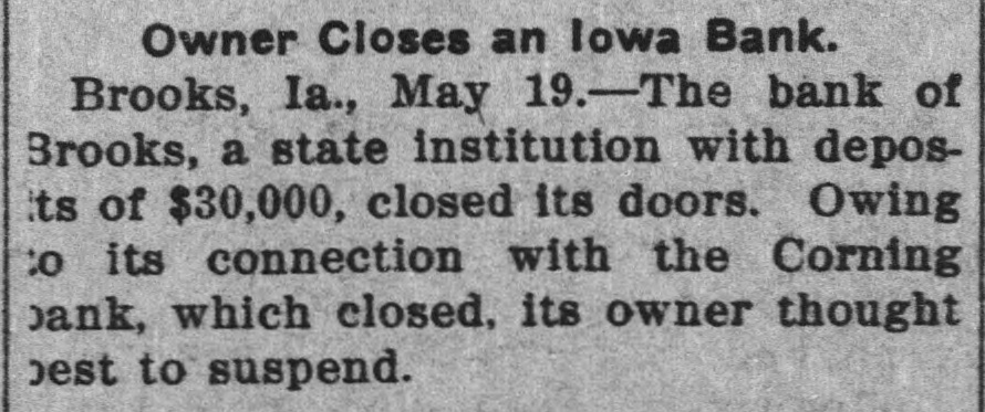 Owner Closes an lowa Bank. Brooks, Ia., May 19.-The bank of Brooks, a state institution with deposits of $30,000, closed its doors. Owing to its connection with the Corning bank, which closed, its owner thought best to suspend.