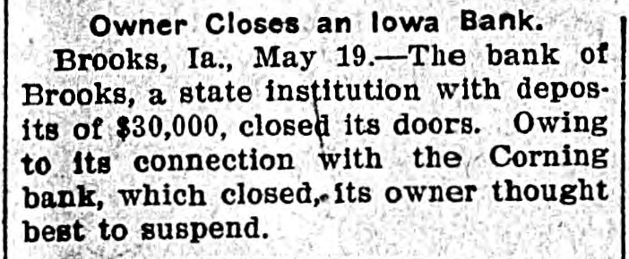 Owner Closes an lowa Bank. Brooks, Ia., May 19.-The bank of Brooks, a state institution with deposits of $30,000, closed its doors. Owing :0 its connection with the Corning bank, which closed. its owner thought best to suspend.