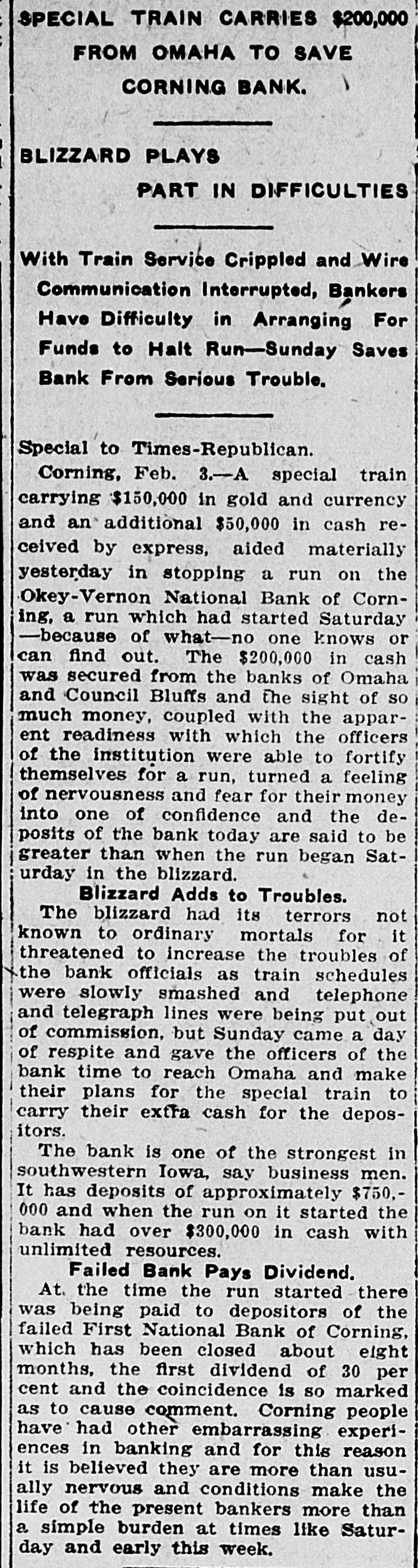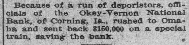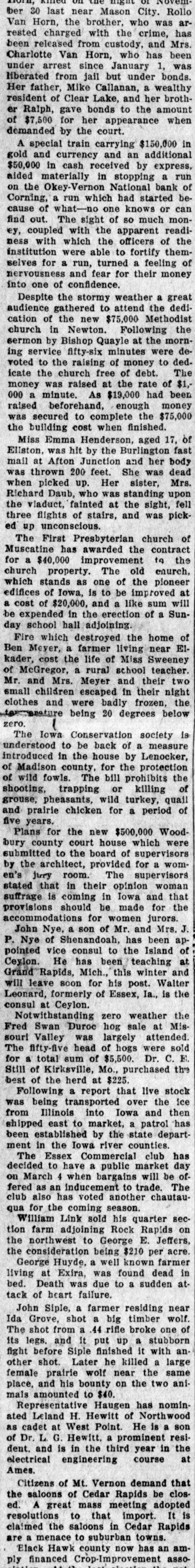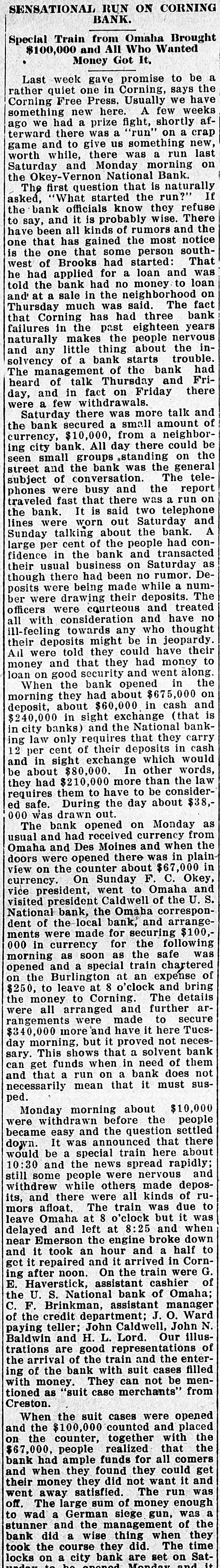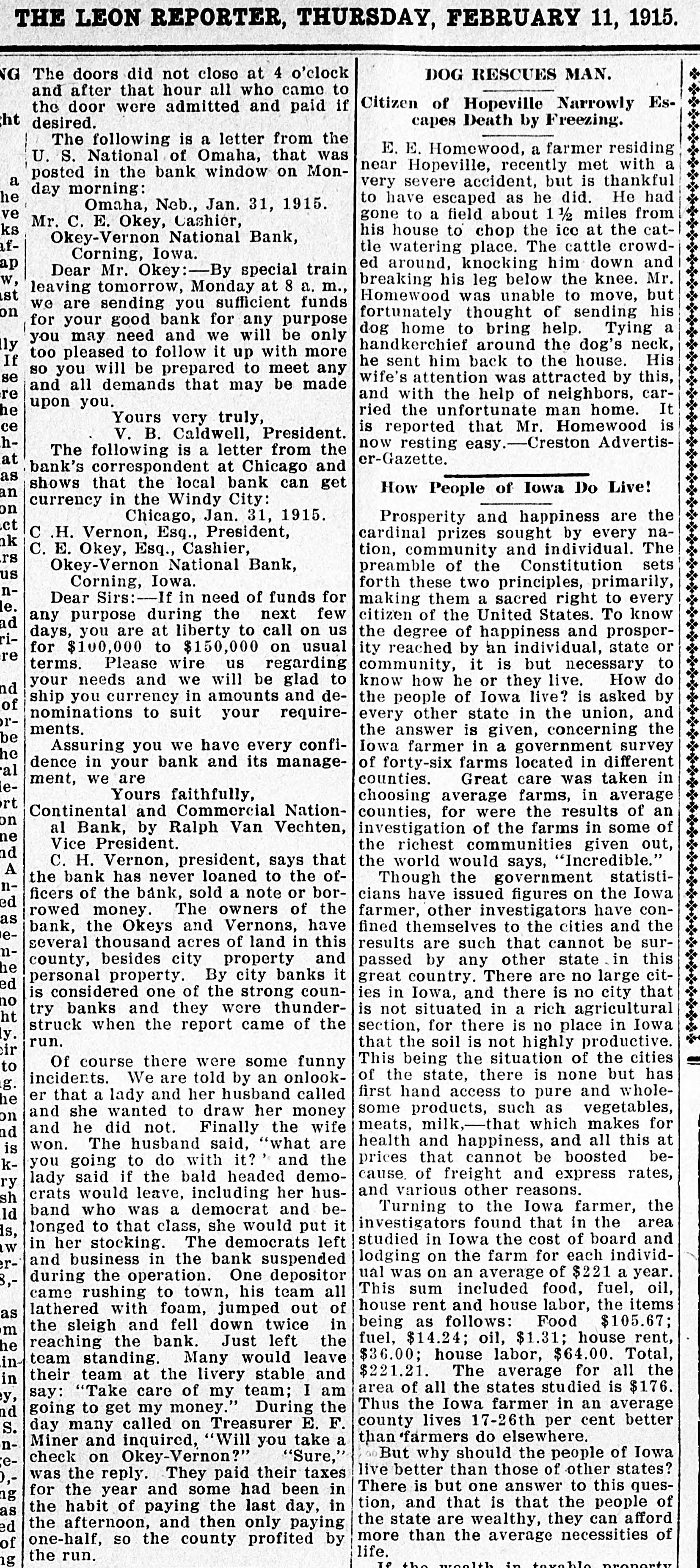 THE LEON REPORTER, THURSDAY, FEBRUARY 11, 1 G The doors did not close at 4 o'clock DOG RESCUES MAN. and after that hour all who came to Citizen of Hopeville Narrowly the door were admitted and paid if capes Death by Freezing. t desired. The following is a letter from the E. E. Homewood, a farmer resi U. S. National of Omaha, that was near Hopeville, recently met wit posted in the bank window on Mona very severe accident, but is than day morning: to have escaped as he did. He Omaha, Neb., Jan. 31, 1915. gone to a field about 1 ½ miles f Mr. C. E. Okey, Cashier, his house to chop the ice at the Okey-Vernon National Bank, tle watering place. The cattle cro Corning, Iowa. p ed around, knocking him down Dear Mr. Okey:-By special train breaking his leg below the knee. leaving tomorrow, Monday at 8 a. m., it Homewood was unable to move, we are sending you sufficient funds n fortunately thought of sending for your good bank for any purpose dog home to bring help. Tyin you may need and we will be only y handkerchief around the dog's n too pleased to follow it up with more f he sent him back to the house. so you will be prepared to meet any e wife's attention was attracted by 1 and all demands that may be made e and with the help of neighbors, upon you. e ried the unfortunate man home. Yours very truly, e is reported that Mr. Homewood V. B. Caldwell, President. now resting easy.-Creston Adve The following is a letter from the er-Gazette. bank's correspondent at Chicago and S shows that the local bank can get How People of Iowa Do Live n currency in the Windy City: n Chicago, Jan. 31, 1915. Prosperity and happiness are C .H. Vernon, Esq., President, cardinal prizes sought by every k C. E. Okey, Esq., Cashier, tion, community and individual. S Okey-Vernon National Bank, preamble of the Constitution S Corning, Iowa. forth these two principles, prima Dear Sirs:-If in need of funds for making them a sacred right to et citizen of the United States. To k any purpose during the next few d days, you are at liberty to call on us the degree of happiness and pros for $100,000 to $150,000 on usual ity reached by an individual, stat e terms. Please wire us regarding community, it is but necessary your needs and we will be glad to know how he or they live. How d ship you currency in amounts and dethe people of Iowa live? is asked nominations to suit your requireevery other state in the union, ments. the answer is given, concerning e Assuring you we have every confiIowa farmer in a government sur e dence in your bank and its manageof forty-six farms located in diffe counties. Great care was taker ment, we are Yours faithfully, choosing average farms, in aver t Continental and Commercial Nationcounties, for were the results of n al Bank, by Ralph Van Vechten, investigation of the farms in som Vice President. the richest communities given d C. H. Vernon, president, says that the world would says, "Incredible the bank has never loaned to the ofThough the government stat ficers of the bank, sold a note or borcians have issued figures on the I d rowed money. The owners of the farmer, other investigators have S fined themselves to the cities and bank, the Okeys and Vernons, have several thousand acres of land in this results are such that cannot be county, besides city property and passed by any other state in e personal property. By city banks it great country. There are no large d is considered one of the strong counies in Iowa, and there is no city is not situated in a rich agricult try banks and they were thunderstruck when the report came of the section, for there is no place in I run. that the soil is not highly product This being the situation of the ci Of course there were some funny of the state, there is none but incidents. We are told by an onlookfirst hand access to pure and wh er that a lady and her husband called some products, such as vegetal and she wanted to draw her money meats, milk,-that which makes and he did not. Finally the wife health and happiness, and all thi won. The husband said, "what are S prices that cannot be boosted you going to do with it? and the cause. of freight and express ra lady said if the bald headed demoand various other reasons. crats would leave, including her husTurning to the Iowa farmer, band who was a democrat and bed investigators found that in the a longed to that class, she would put it studied in Iowa the cost of board in her stocking. The democrats left lodging on the farm for each indi and business in the bank suspended ual was on an average of $221 a y during the operation. One depositor This sum included food, fuel, came rushing to town, his team all house rent and house labor, the it lathered with foam, jumped out of being as follows: Food $105 the sleigh and fell down twice in fuel, $14.24; oil, $1.31; house r reaching the bank. Just left the $36.00; house labor, $64.00. To team standing. Many would leave $221.21. The average for all their team at the livery stable and n area of all the states studied is $ say: "Take care of my team; I am Thus the Iowa farmer in an aver going to get my money." During the d county lives 17-26th per cent be day many called on Treasurer E. F. than farmers do elsewhere. Miner and inquired, "Will you take a But why should the people of I "Sure," check on Okey-Vernon?" live better than those of other sta was the reply. They paid their taxes There is but one answer to this q for the year and some had been in tion, and that is that the people the habit of paying the last day, in S the state are wealthy, they can af the afternoon, and then only paying more than the average necessitie one-half, SO the county profited by life. the run. If the wealth in texable prop